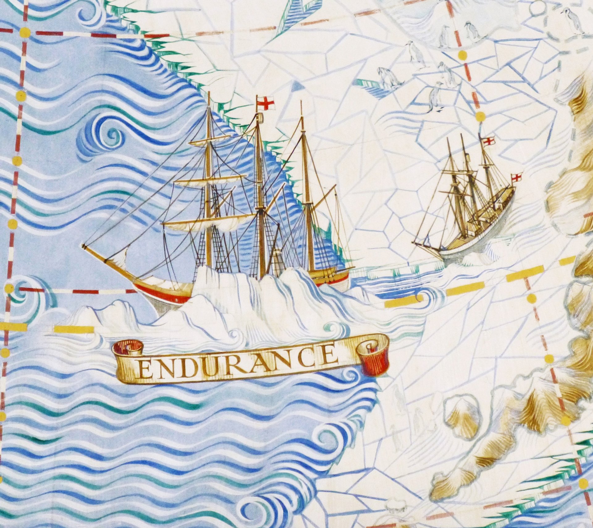A secular painted ceiling: Detail from Max Gill's map of Antarctica, showing Ernest Shackleton's ship Endurance trapped in the ice, at the Scott Polar Research Institute, Cambridge, 1934