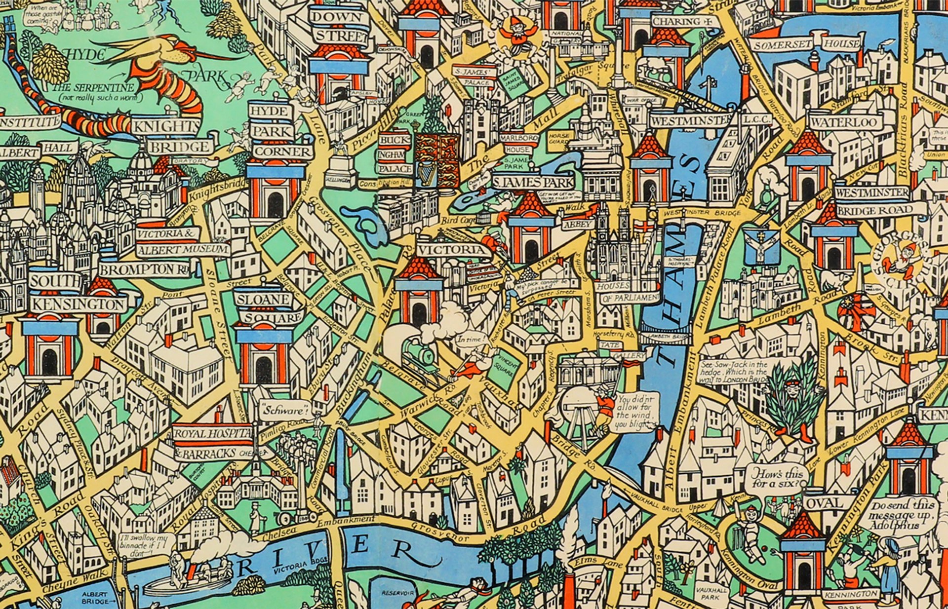 Pictorial burlesque: Detail from Max Gill's Wonderground map for London Transport, 1914