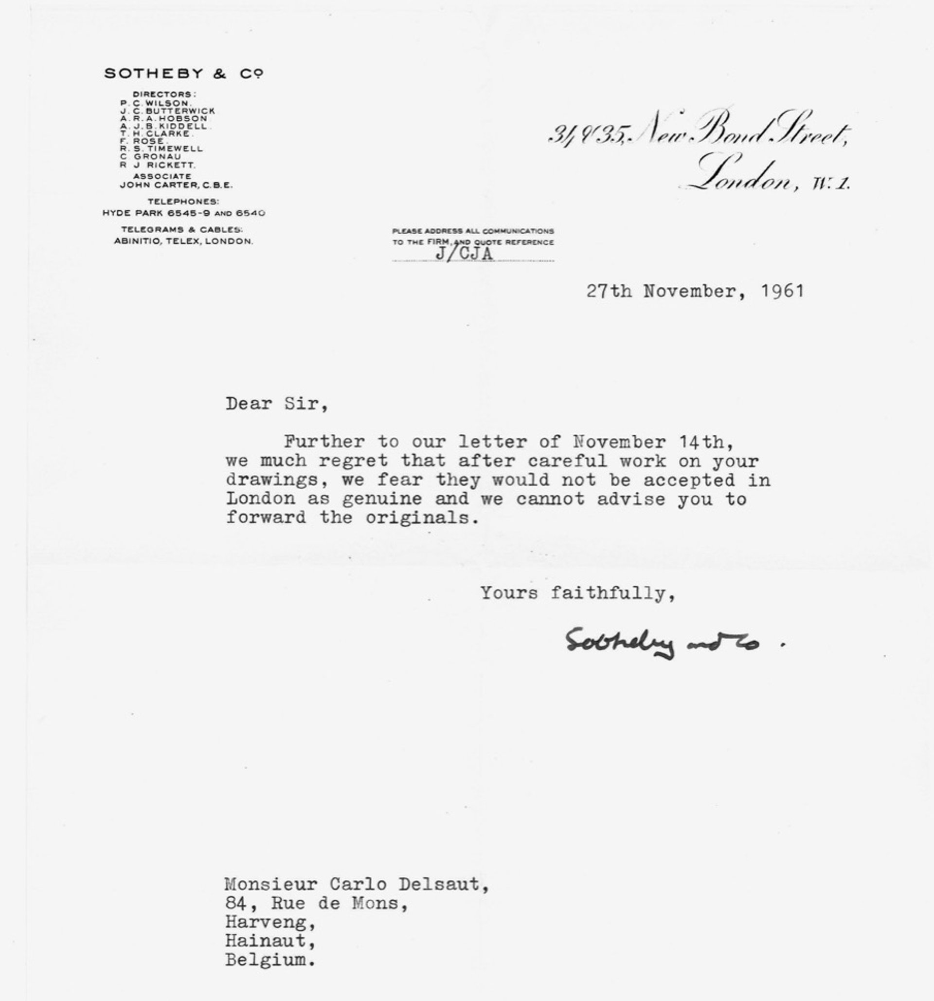 Delsaut and his son Carlo decided to sell the sketches. After this length of time it is impossible to know what examination the two major auction houses undertook. Sotheby’s decided that they were not authentic—but Christie’s proved willing to proceed. The drawings eventually sold for £4,200 each at Christie’s in 1970.