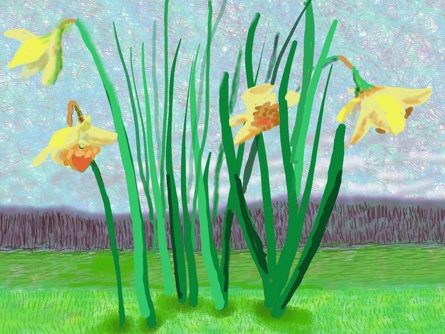 Hockney has produced these pictures on his iPad, which he says requires the ability to draw as well as paint. Remarkably prolific, he will eventually have produced 220 works for 2020.