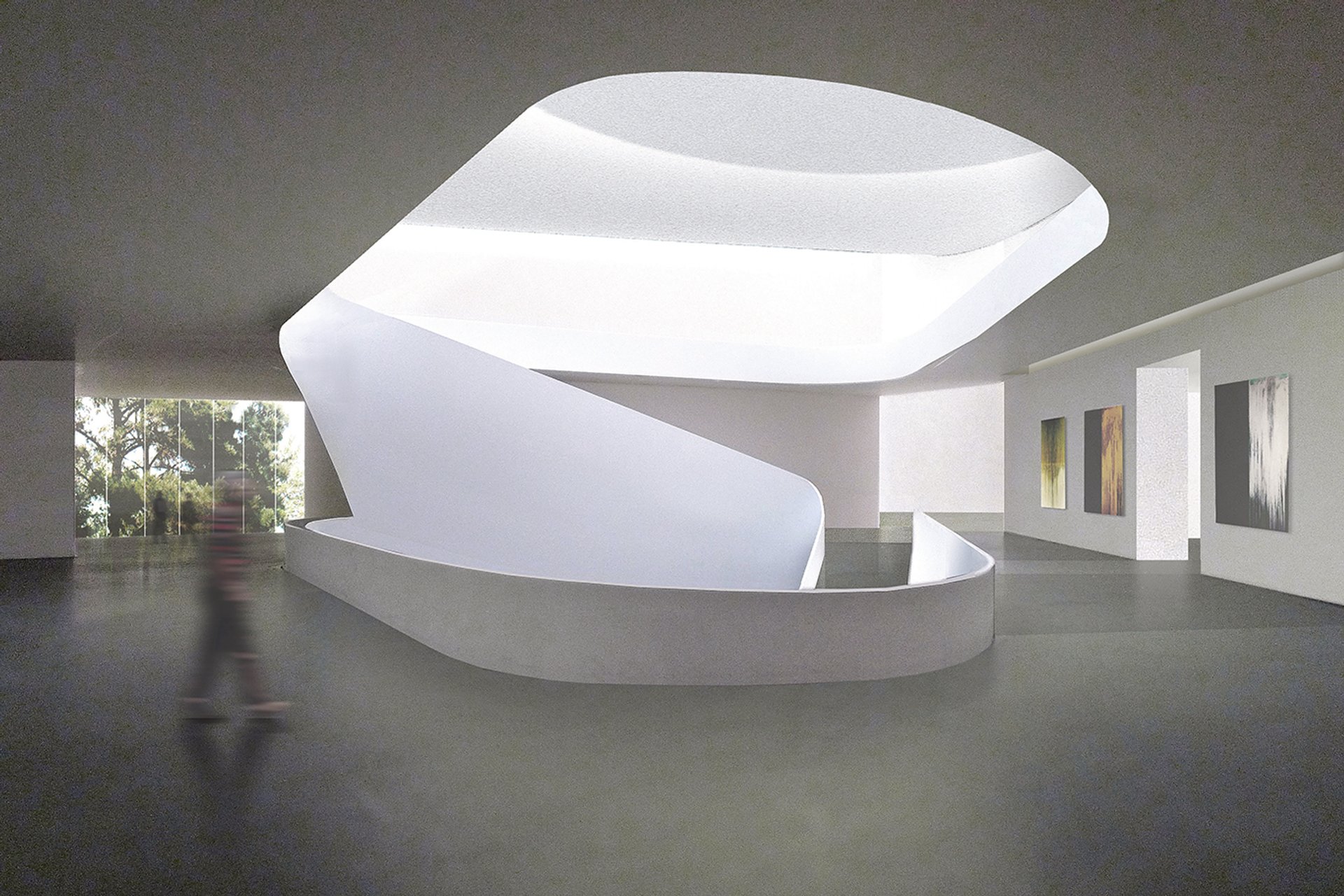 Holl says his design was inspired by the Texas sky. “Concave curves, imagined from cloud circles, push down on the roof geometry, allowing natural light to slip in with precise measure and quality—perfect for top-lit galleries,” he says. “The undersides of the curved ceiling become light reflectors, catching and sliding the light across each unique gallery experience.”
