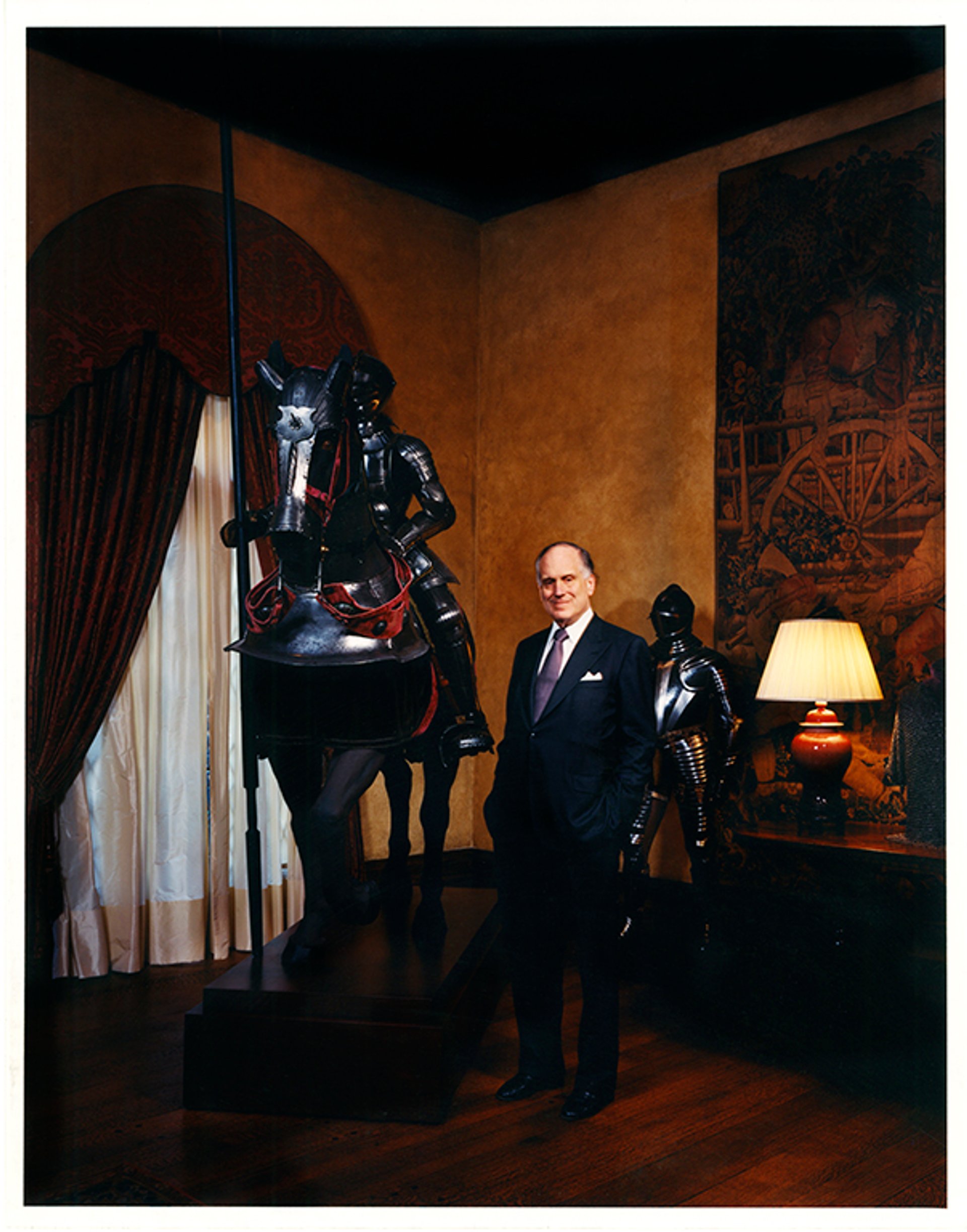 Ronald S. Lauder in his home, flanked by a knight and charger in German armour from 1515-30, left, and an Italian suit of armour from around 1600-10 Mark Hiethoff
