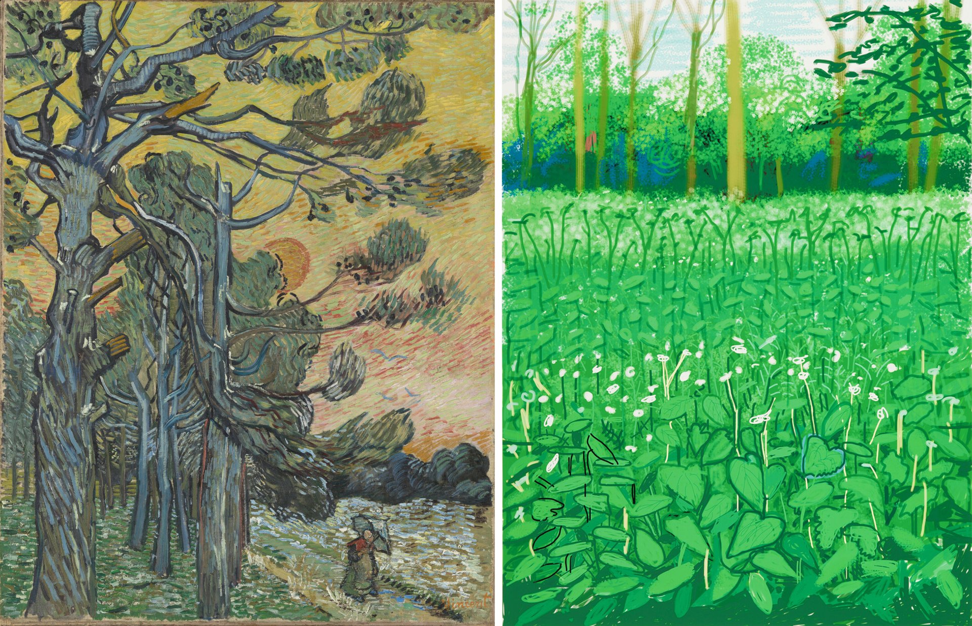 Left: Vincent van Gogh’s Pine Trees at Sunset (December 1889) and right: David Hockney’s The Arrival of Spring in Woldgate, East Yorkshire in 2011 - 6 May Van Gogh: courtesy of the Kröller-Müller Museum, Otterlo. Hockney: courtesy of the David Hockney Foundation © David Hockney, photo: Richard Schmidt