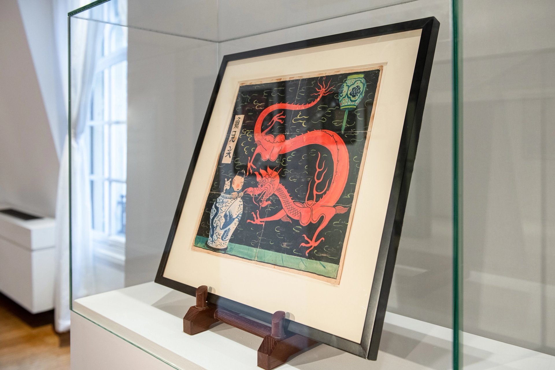 The item, designed by the Belgian illustrator Hergé (born Georges Remi), was intended as a front cover for The Blue Lotus volume dating from 1936, which tells of Tintin’s travels in China during the Japanese invasion of 1931.
