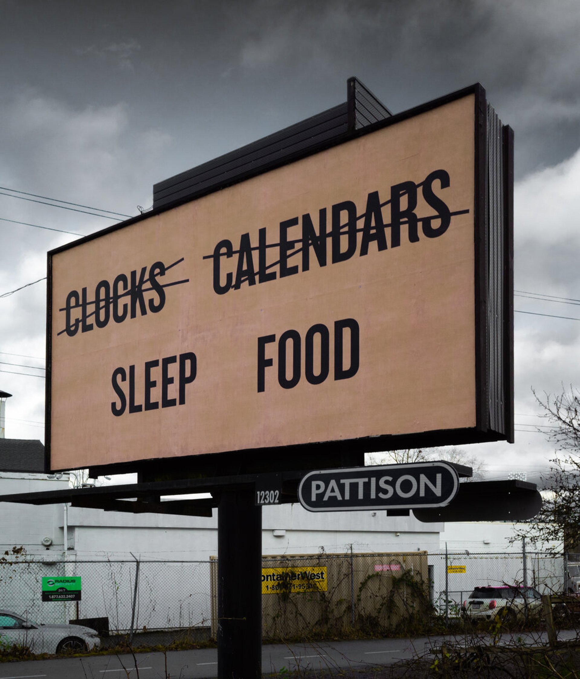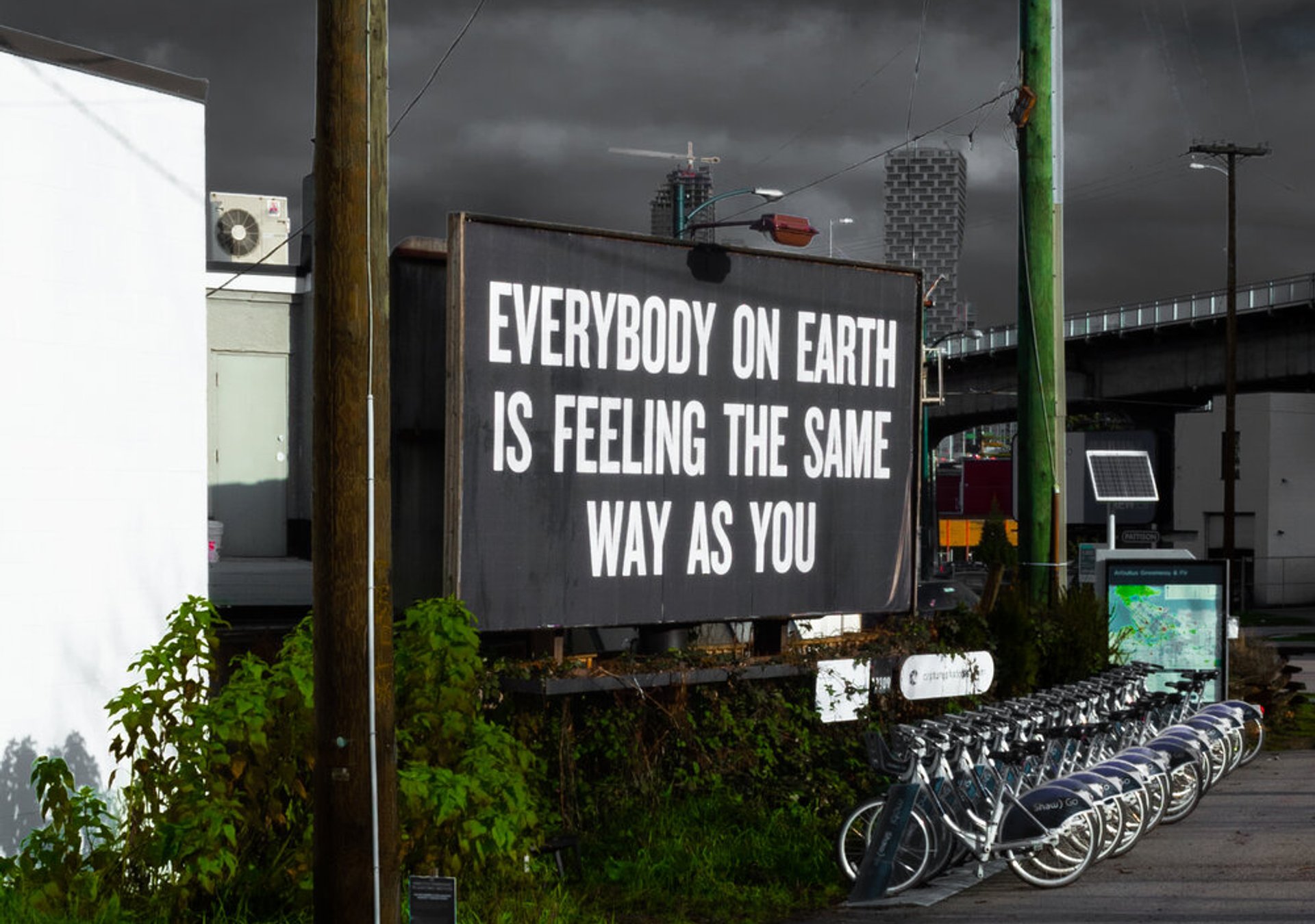 Now, as Vancouverites navigate the grey, West Coast winter twilight, they are jolted to attention by the boisterous billboards. Enforced Leisure Time is Neither announces itself against a bold red background and in front of a generic-looking apartment complex. Doing Nothing is Very Different from Having Nothing to Do is proclaimed on a bright fuchsia background billboard, bridging a community garden and a mural painted onto a warehouse. Everybody on Earth Is Feeling the Same Way As You lords ironically over a bevy of rental bikes, underlining the pandemic era feeling of no escape, while Hoard Anything You Can’t Download, stated soberly against a blue background, is truer today than ever.