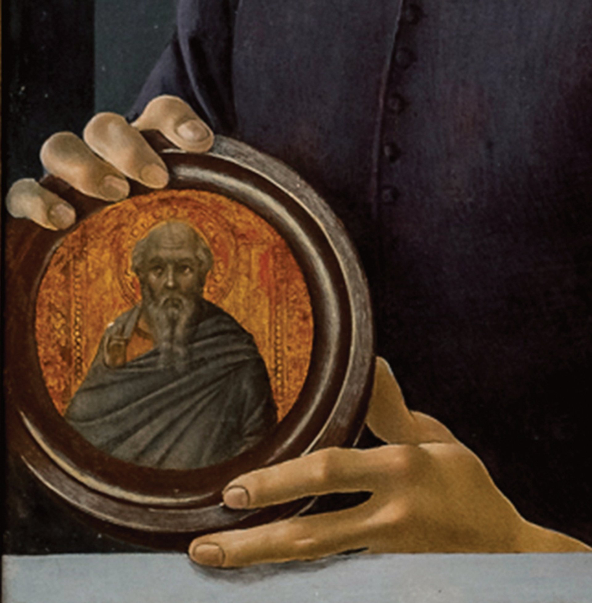 The youth’s handsome, unblemished features contrast markedly with the hoary bearded saint (hand raised in blessing), who gazes abstractedly from within a framed roundel that the sitter holds in his elegant hands. The roundel is tilted slightly towards us, resting on an illusionistic parapet, which the youth’s fingers overlap, spilling into our space. The panel is an actual fragment of a 14th-century altarpiece; 15th-century antique dealers apparently had no qualms in chopping them up. The author of this fragment has been identified as the Sienese painter Bartolomeo Bulgarini. But why would Botticelli have incorporated Bulgarini’s panel into his portrait?