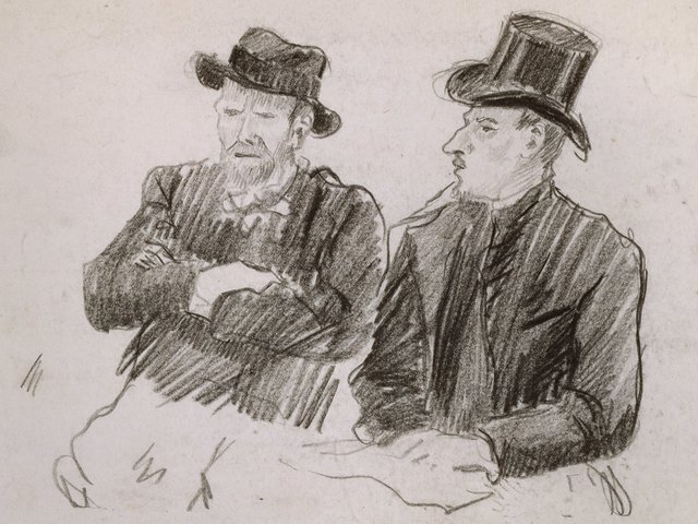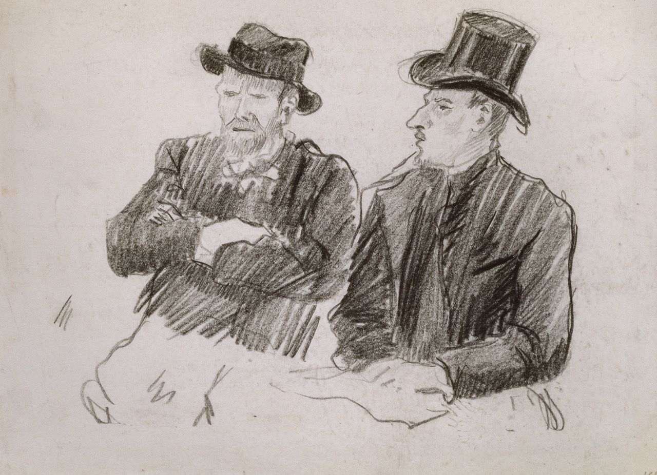 Just below Van Gogh in the drawing is Toulouse-Lautrec himself, almost hidden because of his low stature. He sports a bowler hat, which he frequently wore in photographs. His disguised signature appears on the edge of the bench at the bottom of the drawing, with the two syllables of Lautrec reversed to read “Treclau”.