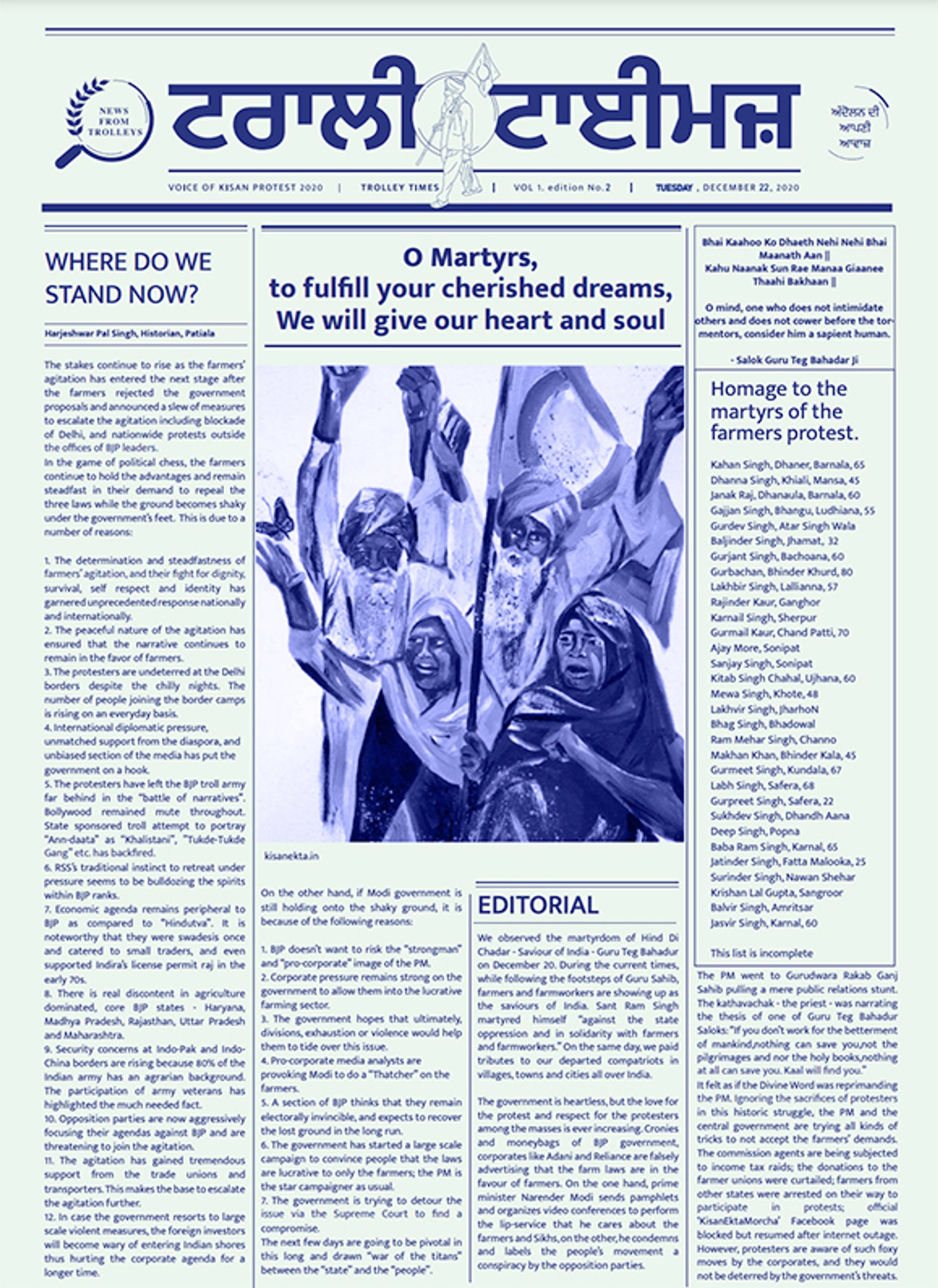 This served as the impetus for a team of Indian artists, writers and agricultural workers to create the Trolley Times—a bi-weekly newspaper, now on its seventh edition, which aims to “voice the truth of the farmers' protest”.