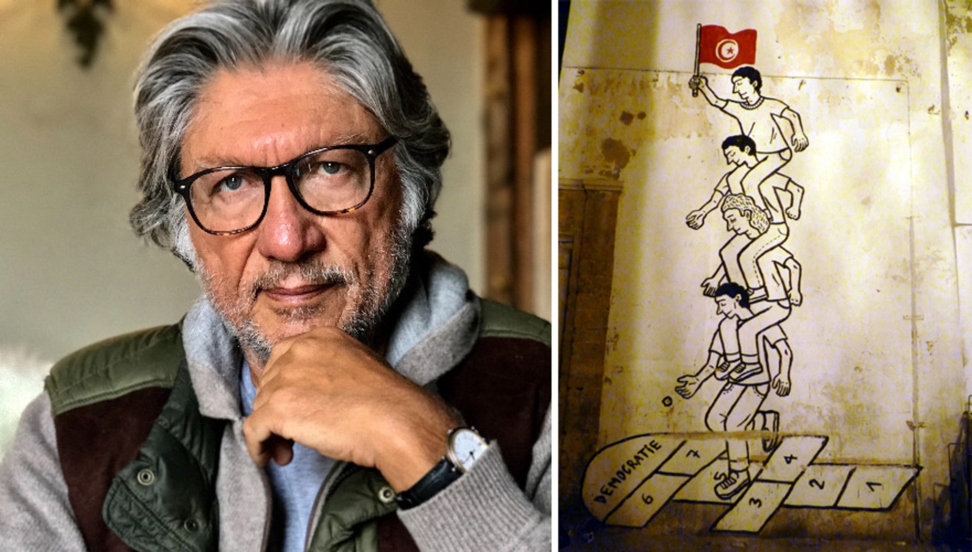 Left: Hossein Amirsadeghi; right: a piece of street art in Tunis from August 2011 expresses the complicated steps towards democracy in Tunisia Street art: SupapleX