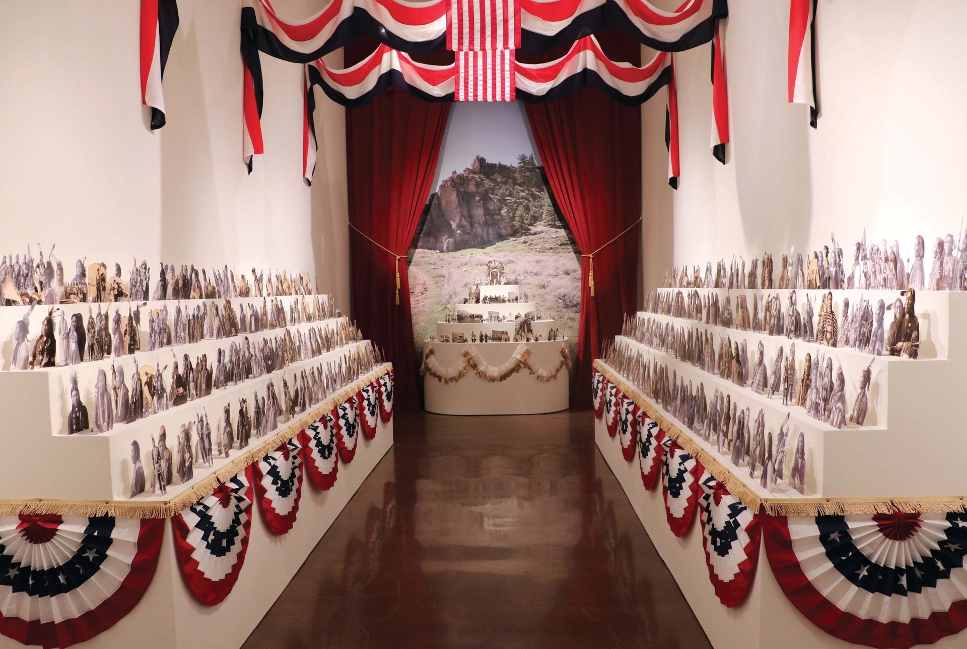 Red Star’s installation uses a collection of sepia photographs documenting the event, taken by Nebraskan photographer Frank Rinehart and his assistant, Adolph Muhr. “I’ve viewed them in a book where you flip through, and I’ve viewed them online in the Omaha Public Library archive where you’re clicking on one image,” says Red Star, a Portland-based artist of Apsáalooke descent whose work often reframes ways of looking at historic photographs of her tribe. Montages from her Accession series entered the permanent collections of both MoMA and the Amon Carter Museum of American Art last year. “I want to have an experience of what that gathering would feel like.”