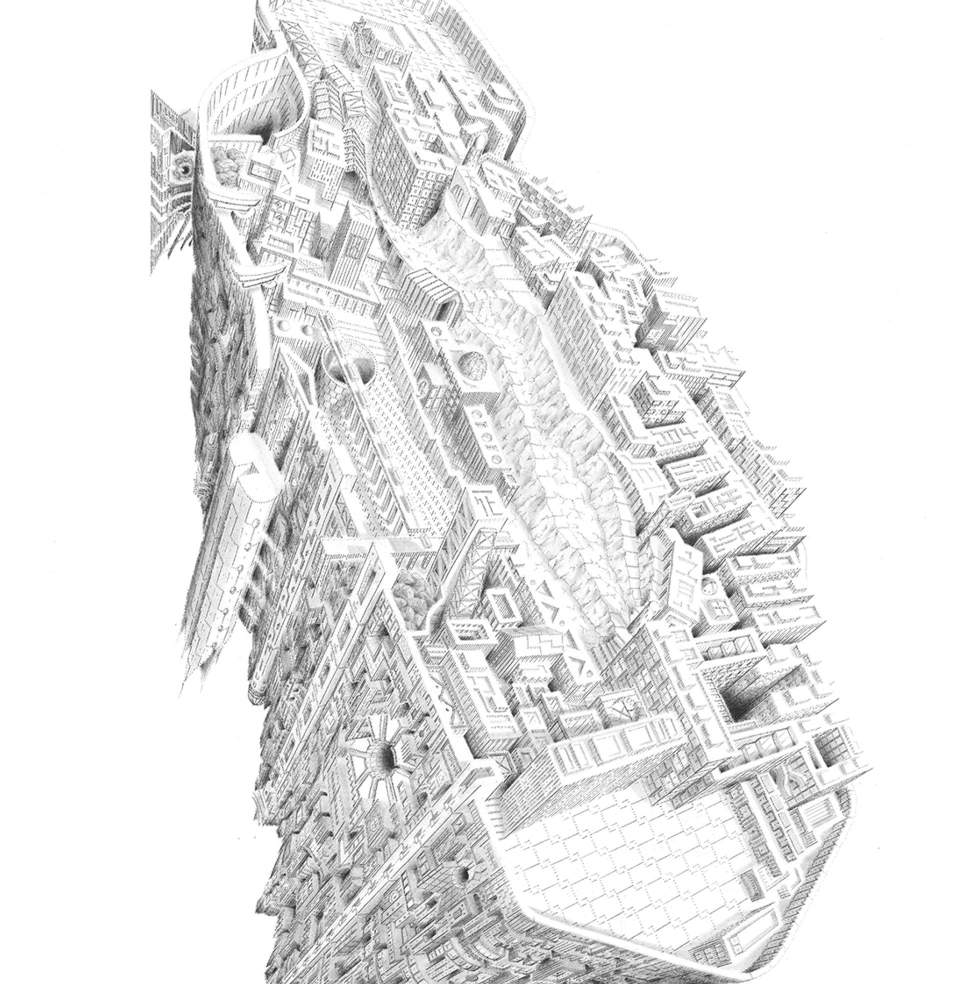 Marc Brousse, an artist-architect from Bordeaux, won the prize in the hand drawn category with Dear Hashima, an amazingly dense drawing in ink, charcoal and invisible ink that makes the island of Hashima off Nagasaki look like a space station.