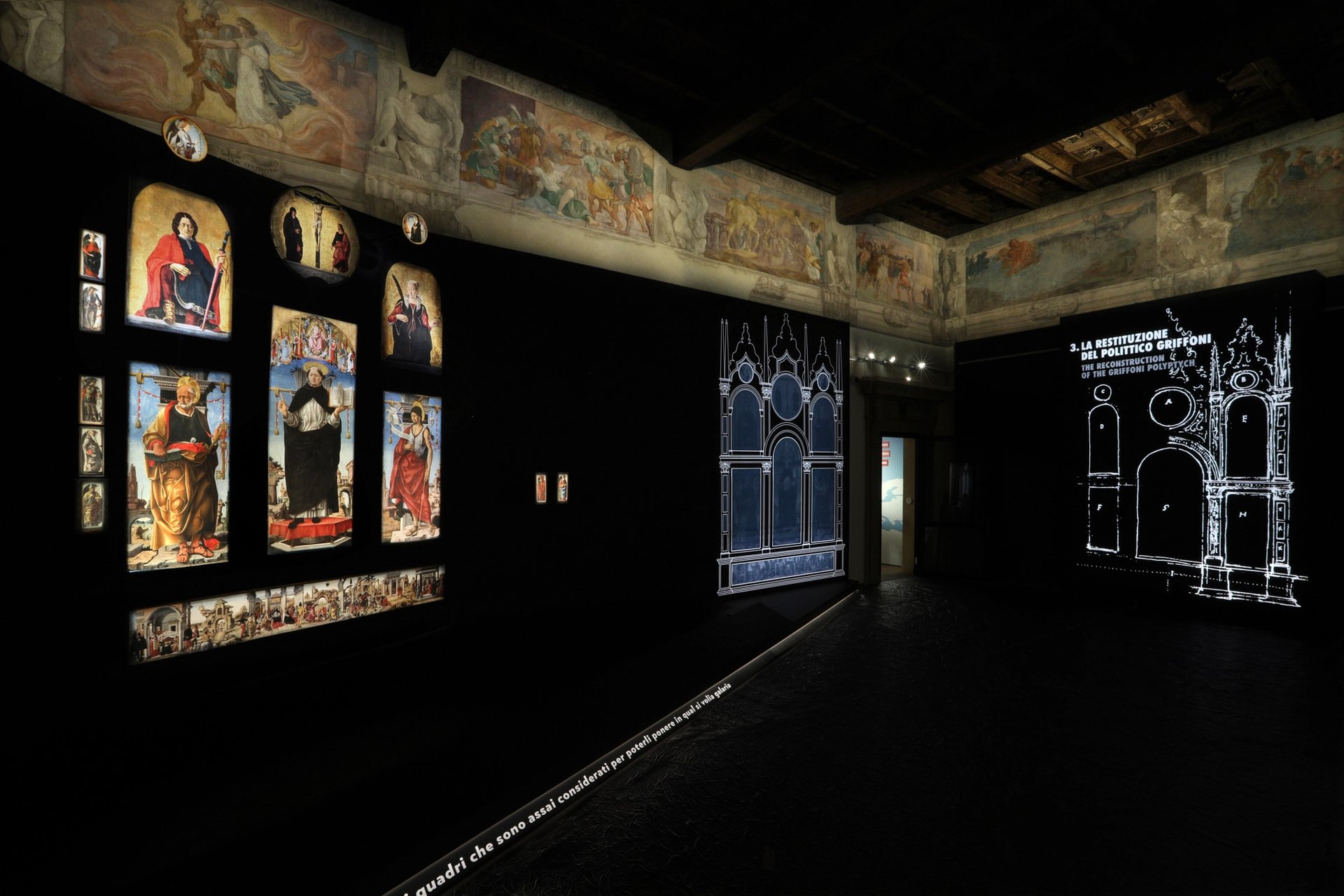 In room three of the exhibition, digital reconstructions of the Polyptych and drawings related to its composition are projected on the walls Photo: Paolo Righi