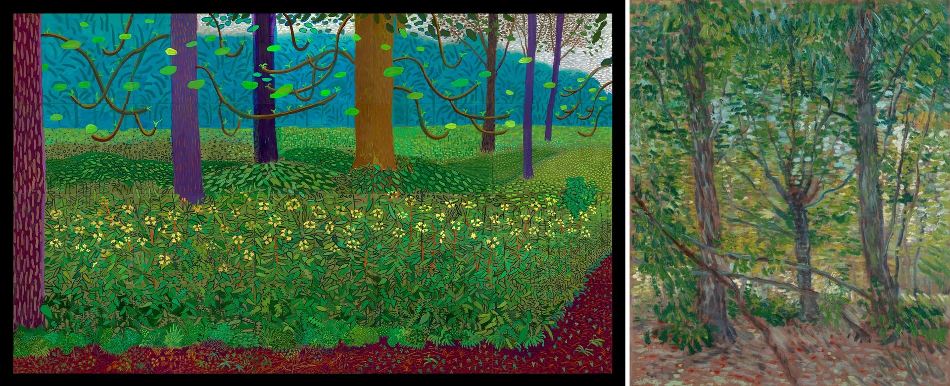 David Hockney’s Under the Trees, Bigger (2010-11, left); and Vincent van Gogh’s Trees (1887, right) David Hockney © David Hockney, photo: Richard Schmidt; Van Gogh Museum, Amsterdam (Vincent van Gogh Foundation)