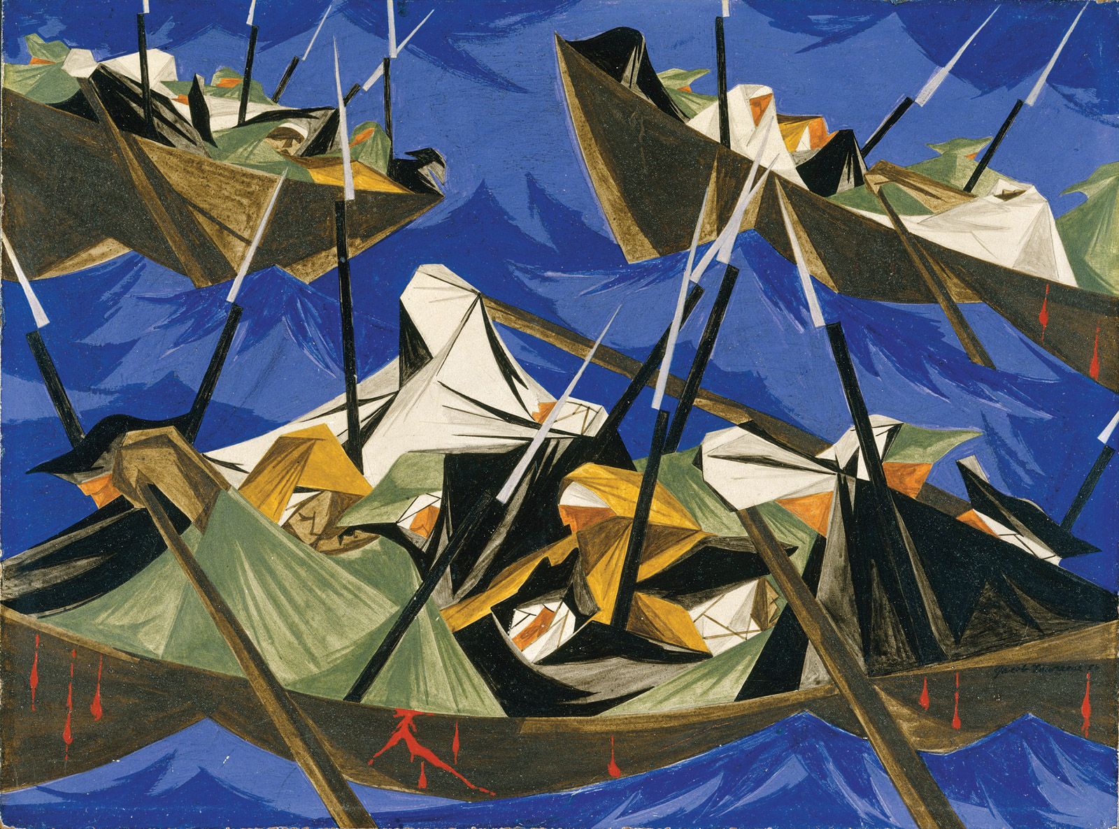 Until its rediscovery, Panel 28 was known through a black-and-white reproduction. PEM says its theme was inspired by a table of immigration statistics published in Richard B. Morris’s Encyclopedia of American History (1953), one of Lawrence’s sources of inspiration for the series. Beginning in the 1820s, the show’s catalogue relates, ships were required to keep lists of passengers travelling to America, who were mostly German, Irish and Jewish immigrants. Today, it notes, such lists make it possible for many Americans to trace their ancestry, “in stark contrast to Americans of African descent whose ancestors’ forced migration into enslavement severed such lineages.”