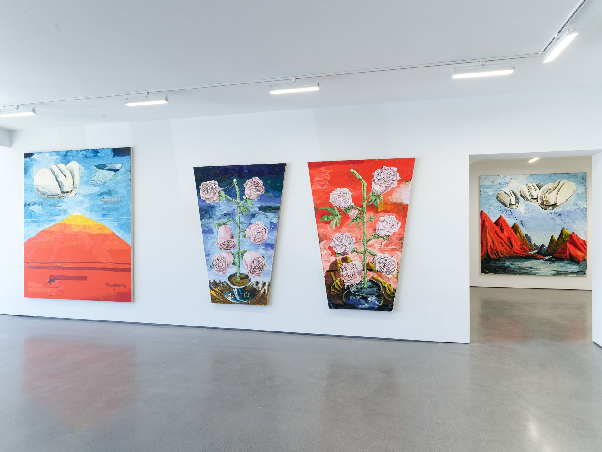 The gallery’s inaugural show, Mountains and Roses, is a display of paintings by the Mexican artist Ken Taylor which explore “our connection to and return to nature”, the artist says. Canvases showing Philip Guston-esque cowboy hats floating over mountain ranges are on view alongside dramatic depictions of giant roses and ceramic sculptures of cowboy hats.