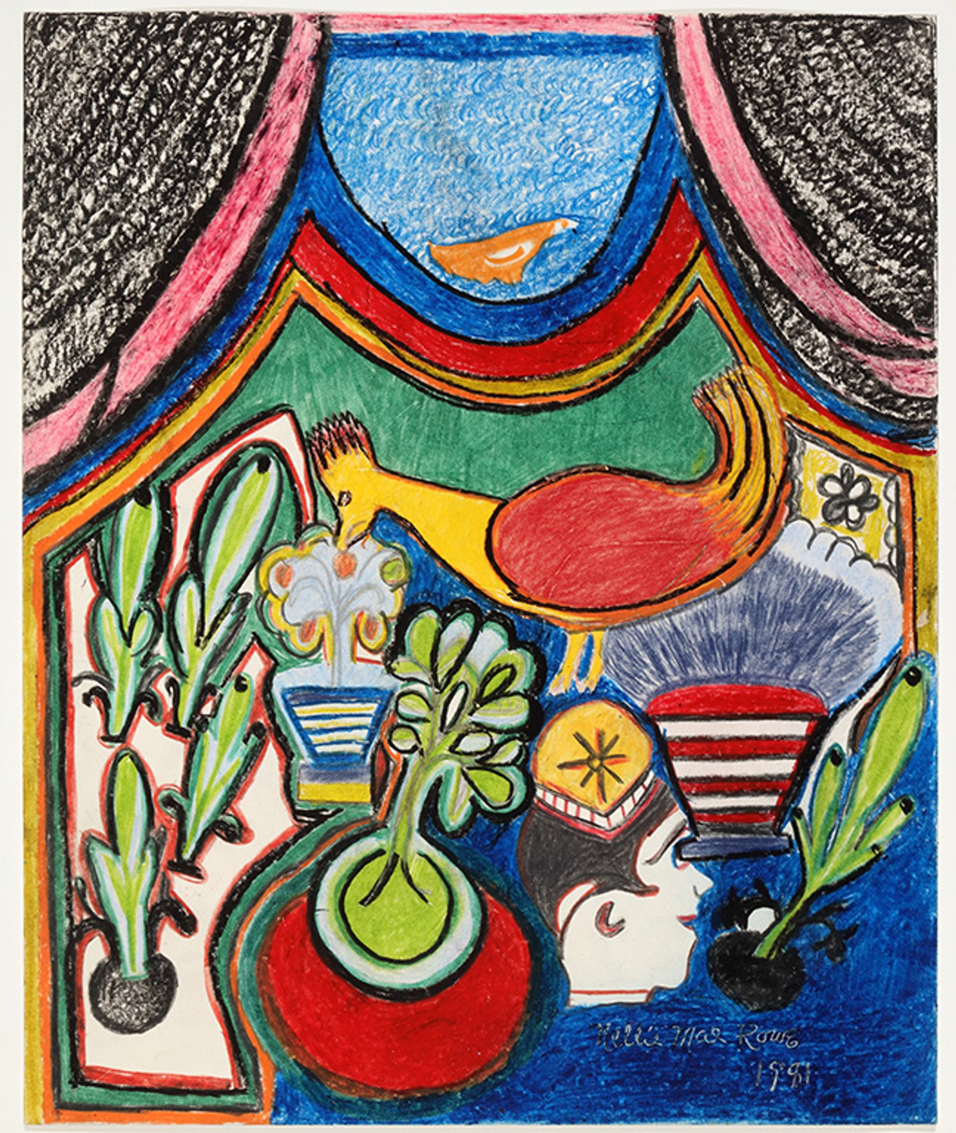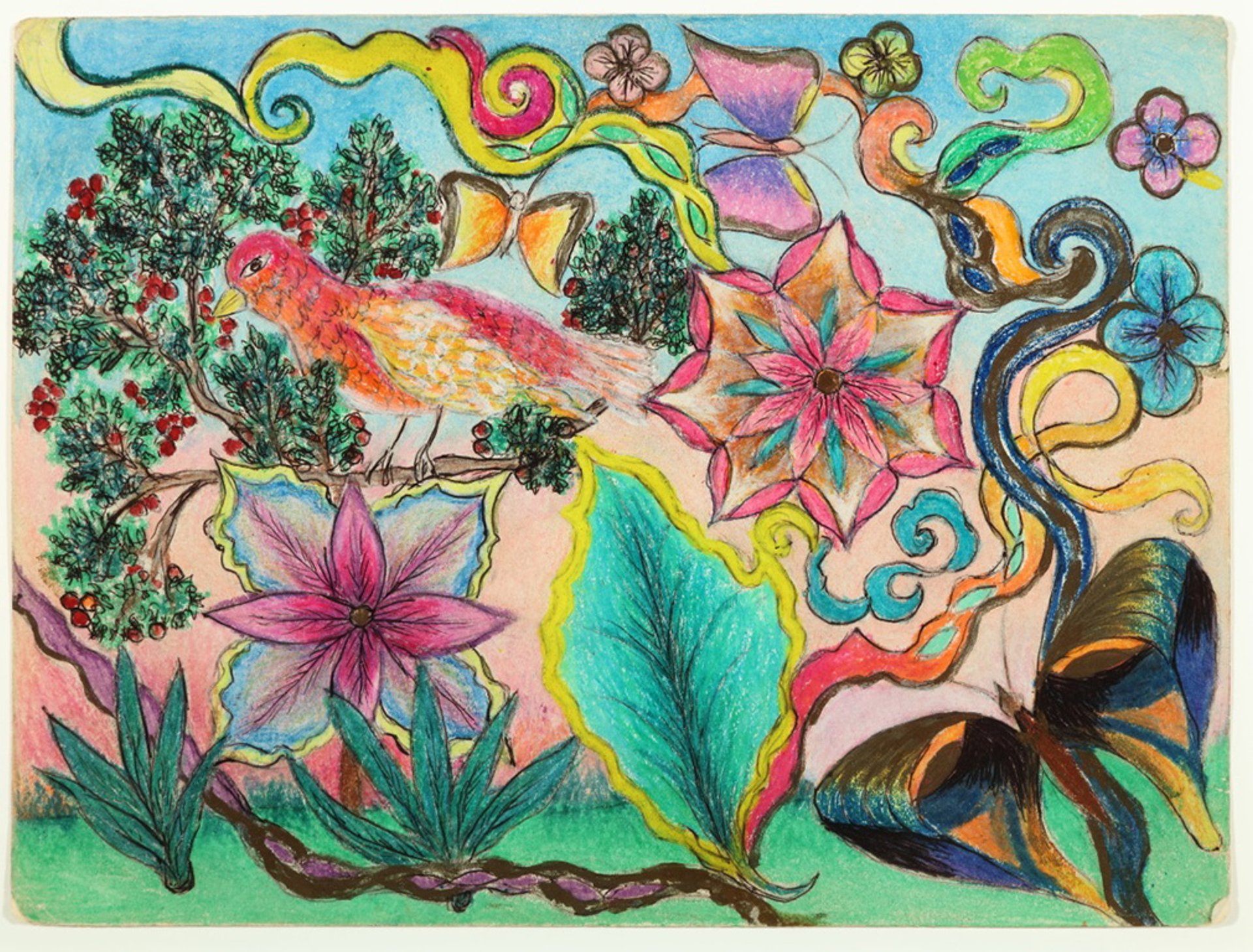 Minnie Evans, Untitled (Bird Perched on Berry Tree), around 1963 Photo by Mike Jensen