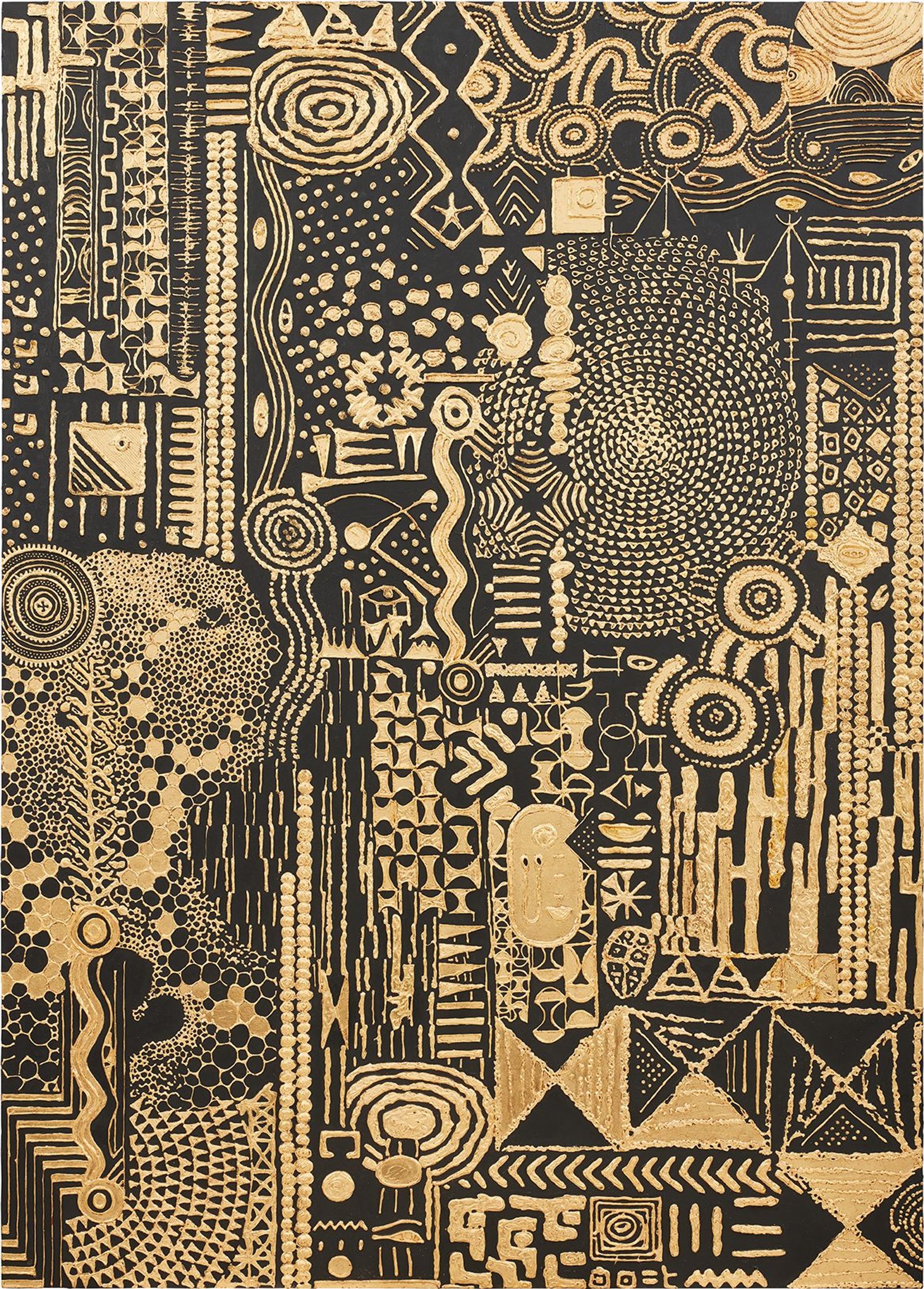 Two other US-based bidders slugged it out for five minutes for Lina Iris Viktor’s auction debut—Constellations III (2016), a hypnotic 24 karat gold, acrylic and gouache on canvas. The work went six times over its low estimate to sell for £155,000 (£195,300 with fees). Meanwhile, two online bidders, in Belgium and Denver, vied for Tunji Adeniyi-Jones’s semi-abstract painting, Love Ritual (2019), which eventually sold to Phillips’s head of online sales, Charlotte Gibbs, for £120,000 (£151,200 with fees)—a record for the artist.