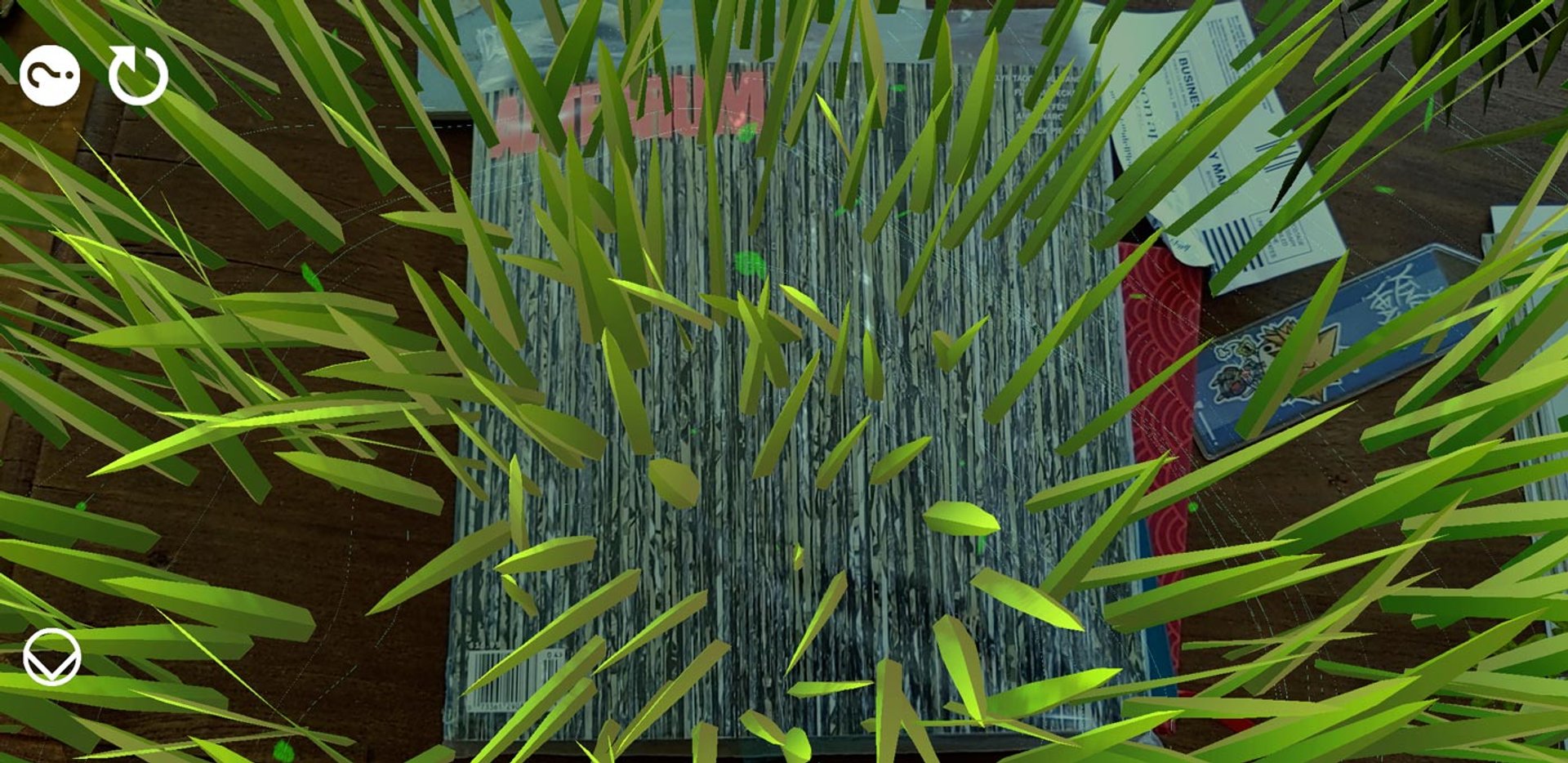 Eron Rauch: There’s this odd visual continuation from the earliest days of this panel reviewing Olafur Eliasson's Wunderkammer that finally coalesced while looking at part two of Rebekah Ubuntu’s Despair, Hope and Healing: the grass modelling and shading is shared by almost all other AR I’ve seen. Are we seeing a certain subset of AR art experiences formulating their own aesthetic genre tropes that involve a certain polygonal reference to natural forms, but on closer inspection also resembles nothing of the sort, fully alien, growing, flowing, shining glossy transmissive psychedelic inner glow on my table, hardwood, bookshelf, cat?