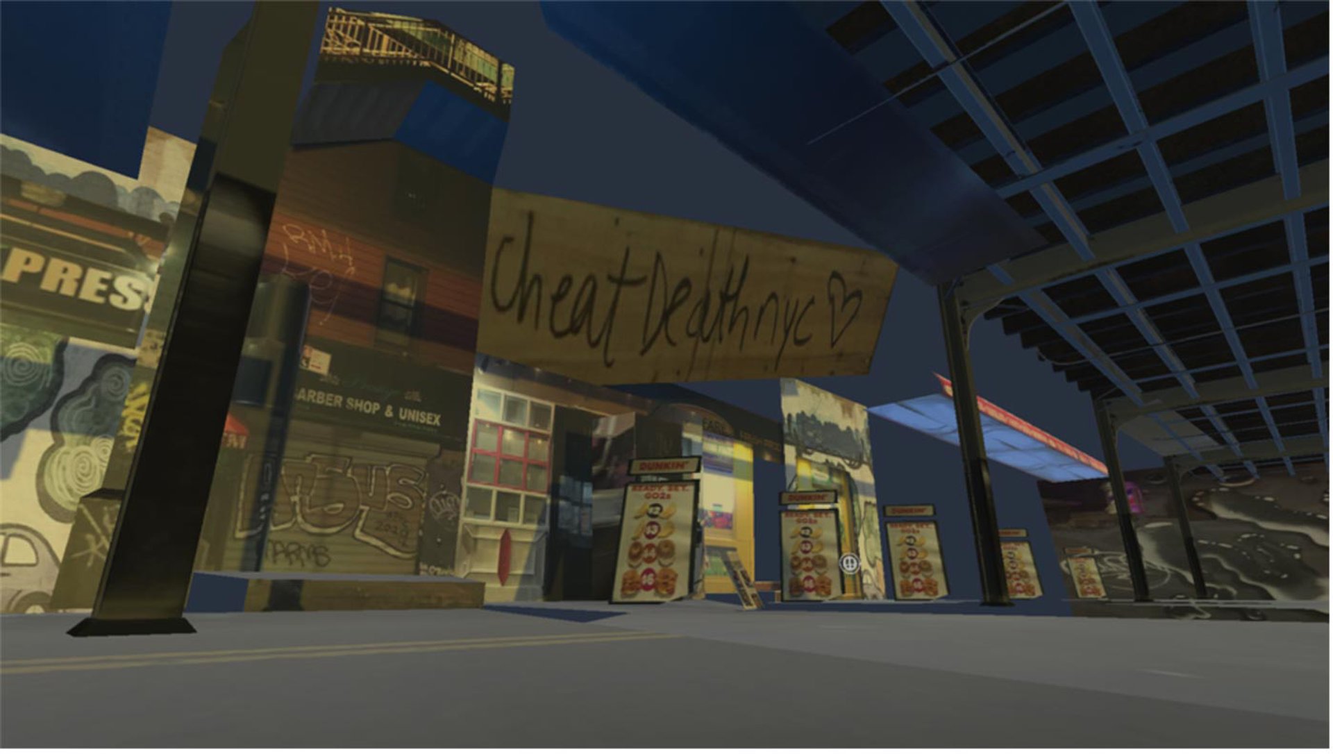 Of the works presented, I lingered mostly inside Sophie Helf’s Myrtle Avenue. Helf created a dimly lit street scene below the M train overpass somewhere in the Bushwick neighborhood of New York. It’s late night. I hear the M train whirr as I look around the dark and desolate street. A barber shop. A deli. Graffiti. Trash. Dunkin. It is then that I encounter the flickering phrases from the artist floating in front of the closed barber shop, whispering that she relishes the sound of the M train, that she cheated death in New York, and that she misses someone. Just like that, still sitting on the couch in my Seoul, Korea, apartment, I’m transported to the New York streets, eavesdropping on incoherent bits of other people’s conversations as I walk past them and encountering curiously artistic objects at random street corners. Helf’s Myrtle Avenue feels exactly like New York, and I realise how much I’ve missed all of it since leaving the city six months ago.