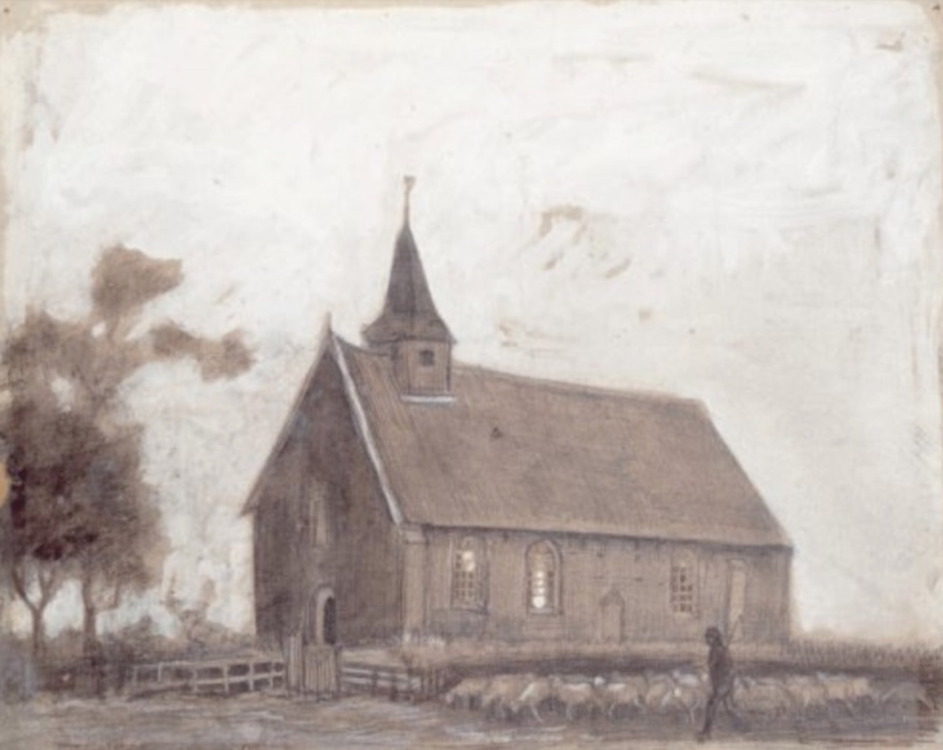Very early one morning, at 3am, Van Gogh took a ride with his Nieuw-Amsterdam landlord to reach the village of Zweeloo—a three-hour journey in an open cart. There he made an atmospheric watercolour, Shepherd with Flock Near the Little Church of Zweeloo (1883). Describing the scene to his brother, he wrote about seeing the return of the flock at dusk representing “the finale of the symphony that I heard”.