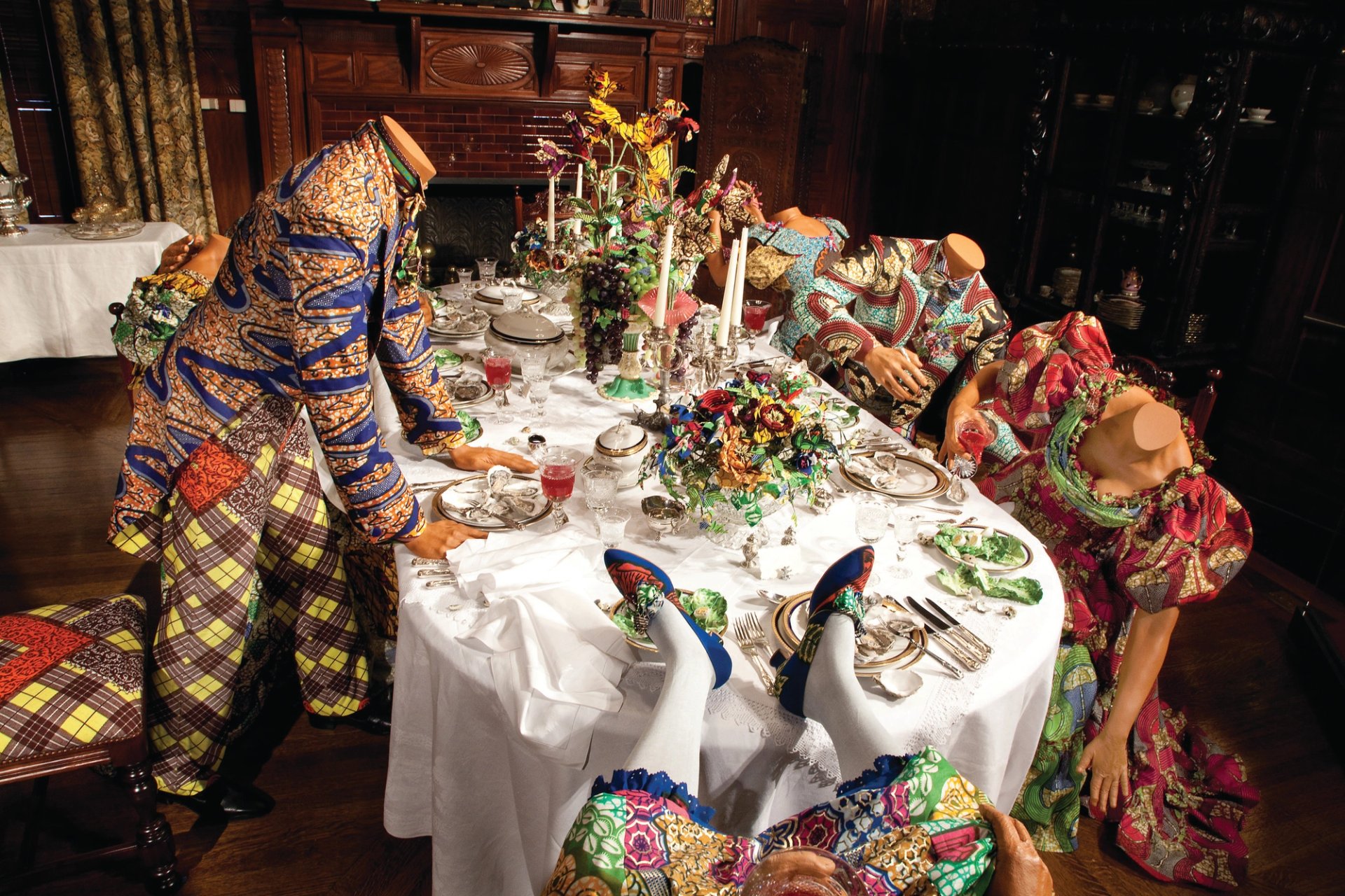 Yinka Shonibare CBE RA, Party Time: Re-imagine America (2008-09); Dimensions variable; Nine fibreglass mannequins; Dutch wax printed cotton textile; leather boots; reproduction wood furniture; cutlery; glassware; taxidermy peacock Courtesy the artist, Stephen Friedman Gallery, London; Newark Museum, New Jersey, purchased in 2010 by Helen McMahon Brady Cutting Fund. Photo: Ross Whitaker. Courtesy of the Newark Museum