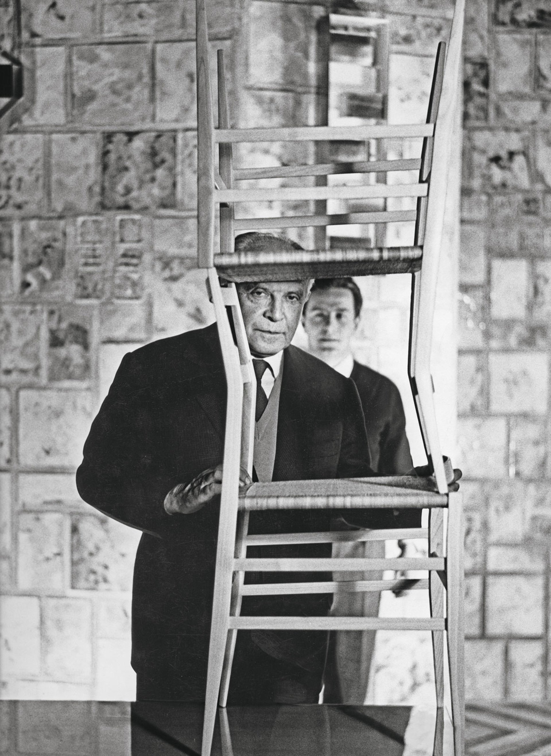 Ponti and his son Giulio photographed in 1957 at the New York office of the Alitalia airline, with two of his signature Superleggera chairs. The slimmed-down, lightweight chairs weighed only 1.7kg and were available in a variety of colours. Ponti would later explain why he thought this “poor nondescript chair” became such a success: “in the anxious drive to express oneself even in the shape of a little nail, we have moved so far away from the spontaneity of truth, from the naturalness and simplicity of things that the appearance of one single thing that is right, spontaneous, ‘real,’ natural, and simple, as we can see, amazes people and is the cause of an absolutely unexpected success.”