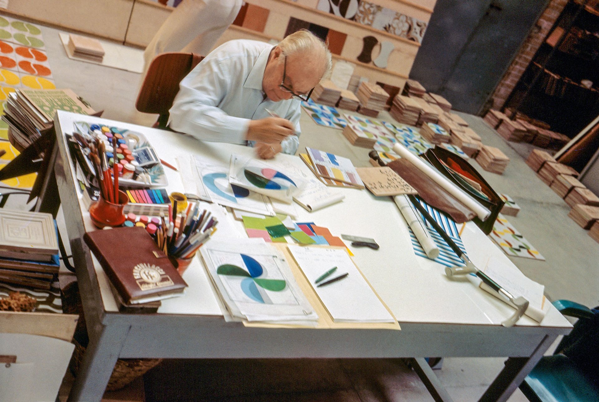 Gio Ponti hard at work designing geometric ceramic floor tiles at the Ceramica D’Agostino factory in Salerno in 1964. The tiles would be used in several of his interiors, including the Parco dei Principi hotels.