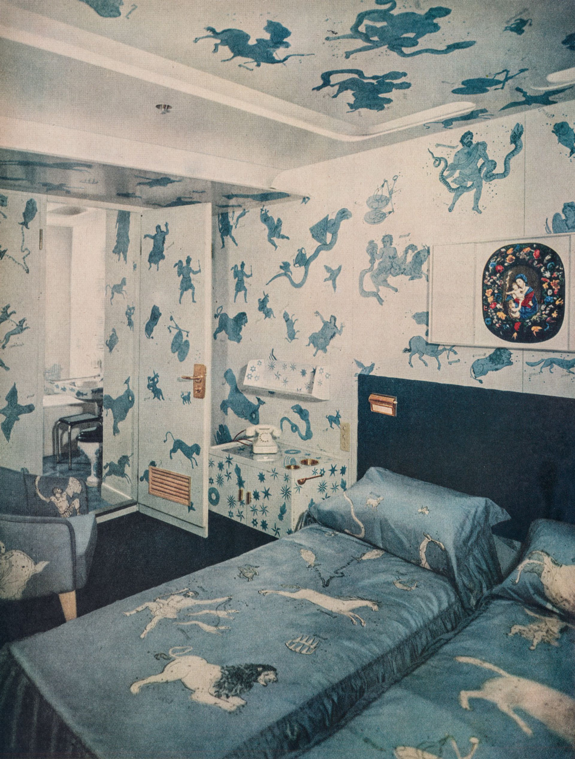 The Zodiac Suite of the Andrea Doria ocean liner was designed by Ponti in collaboration with the Italian artist Piero Fornasetti.