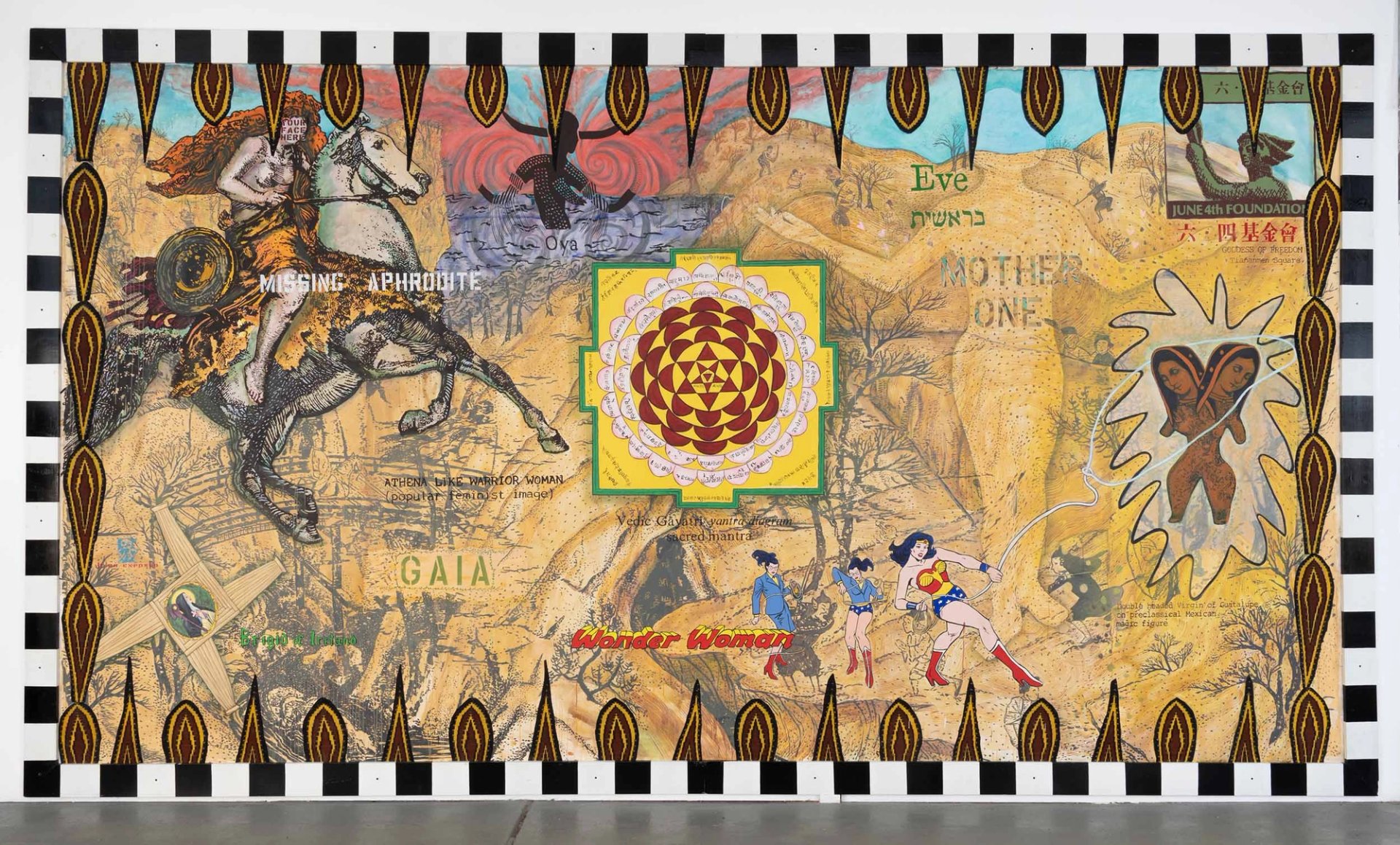 Mary Beth Edelson, In Exile (1989), acrylic, fabric, and collage on canvas