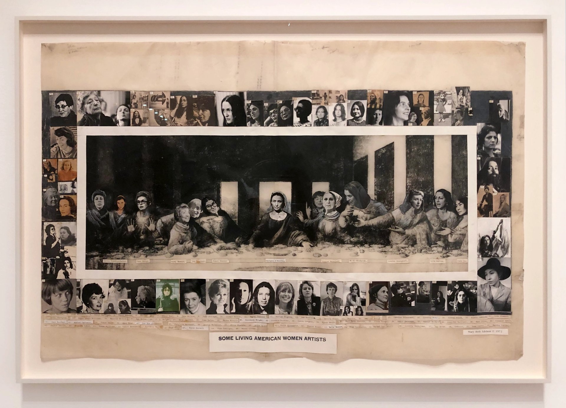 Among the important works Edelson created is the iconic poster Some Living American Women Artists/Last Supper (1972), in which she replaced Christ and his disciples from Leonardo da Vinci’s Last Supper with the faces of women artists cut and pasted from gelatin silver prints, with Georgia O’Keeffe taking Jesus’s spot at the table. The poster mockup is now in the collection of the Museum of Modern Art in New York. In this piece, Edelson was not just taking on the male dominated art world, she was taking a crack at male-centric religion.
