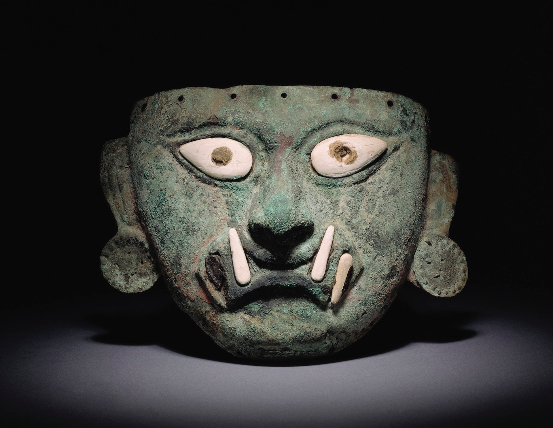 A copper funerary mask with applications of shell and stone, depicting an anthropomorphic visage with feline fangs Museo Larco