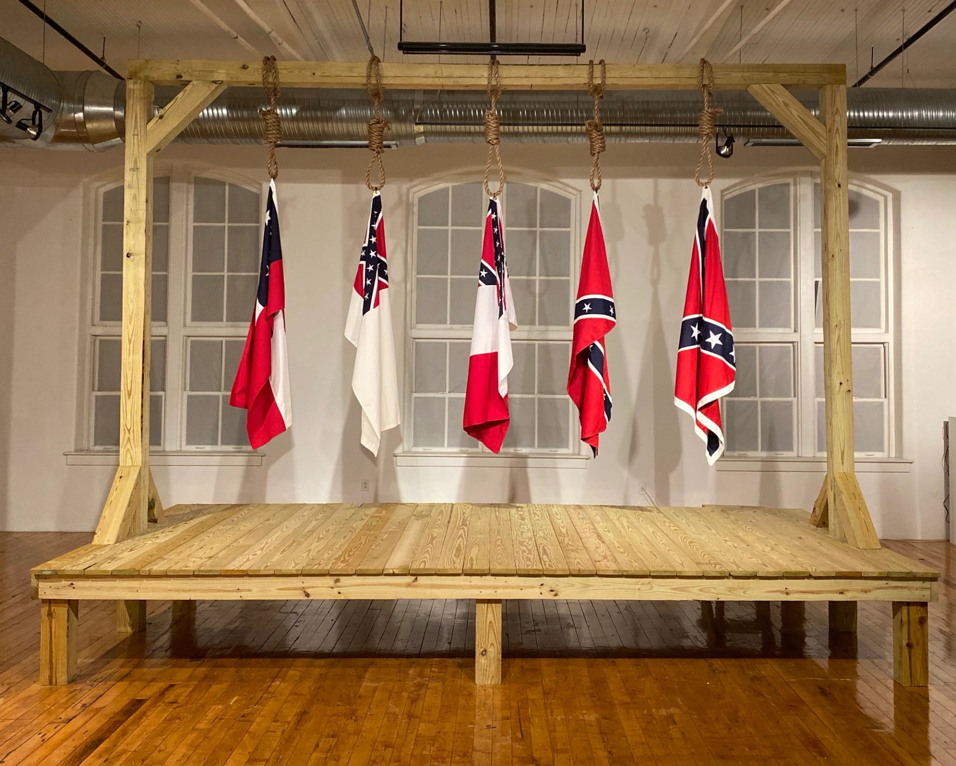 Sims is the current artist-in-residence at the art space, and his centrepiece installation in his show there, Five Flags: A Group Hanging, features a gallows with Confederate flags hanging from nooses. The controversial symbol hung over the South Caroline statehouse until 2015, and just last year Confederate flag supporters, who deny its links with racism and white supremacy, waved the banner around the capitol building on the fifth anniversary of its removal.
