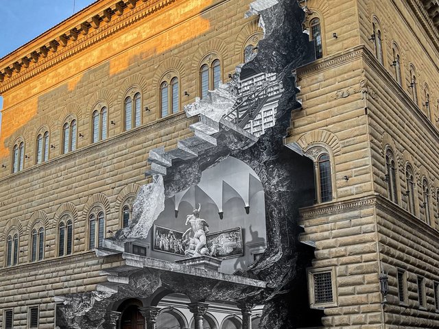 In March, JR unveiled another dramatic work on the façade of the Palazzo Strozzi in Florence, creating an illusory 28m-tall crack in the building, entitled La Ferita (The Wound), that appears to split the gallery in half.