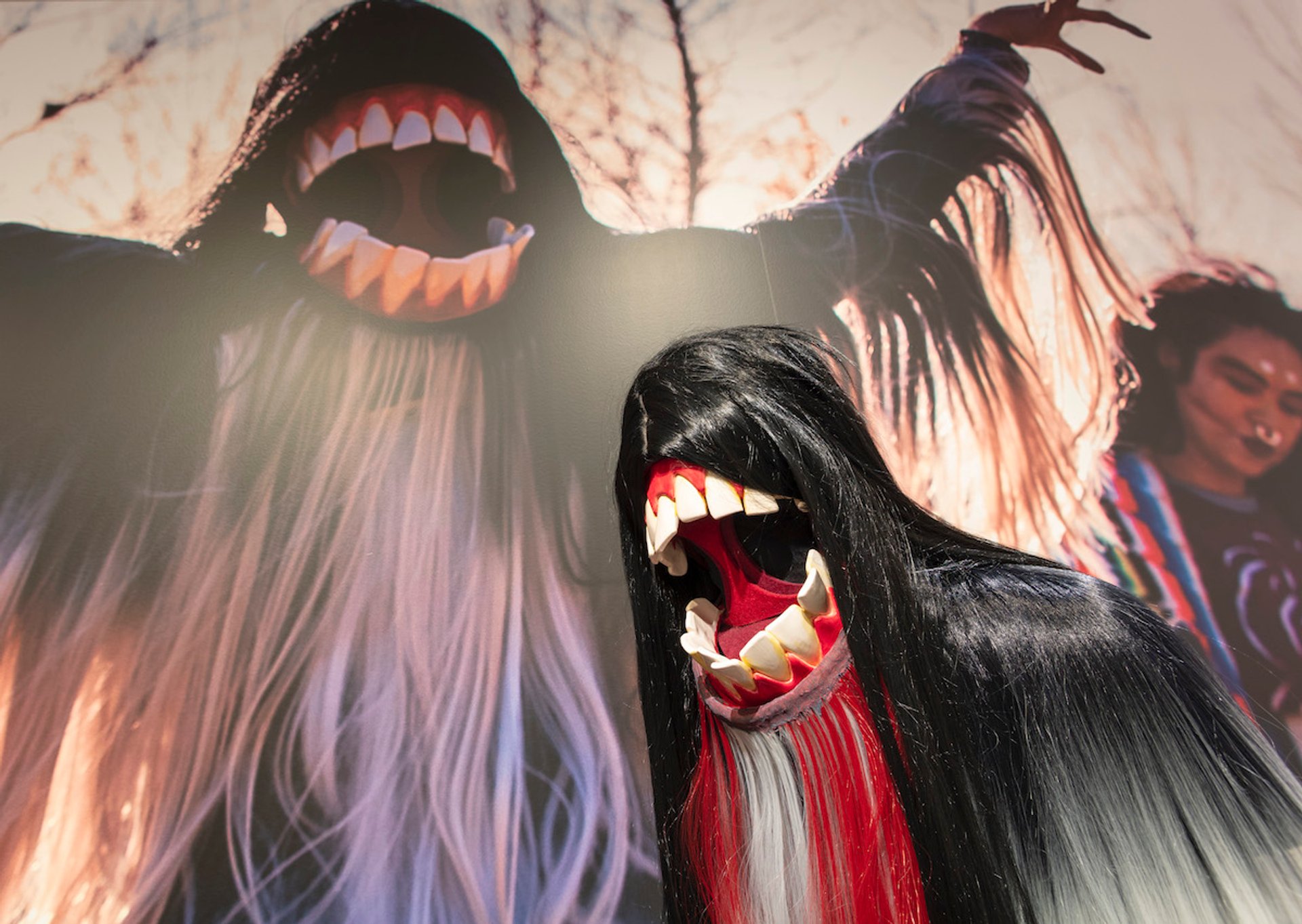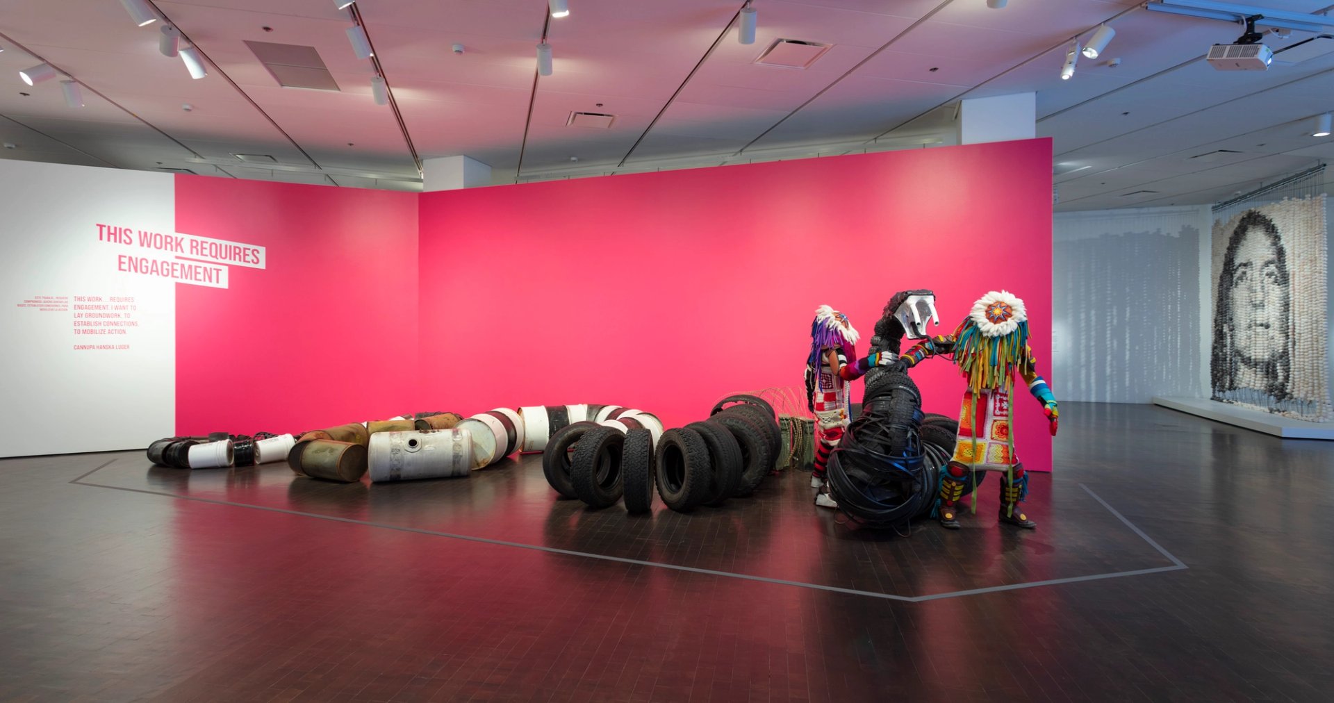 Installation view of Each/Other at the Denver Art Museum showing a costume from Cannupa Hanska Luger's Sweet Land Opera (2020) Courtesy Denver Art Museum