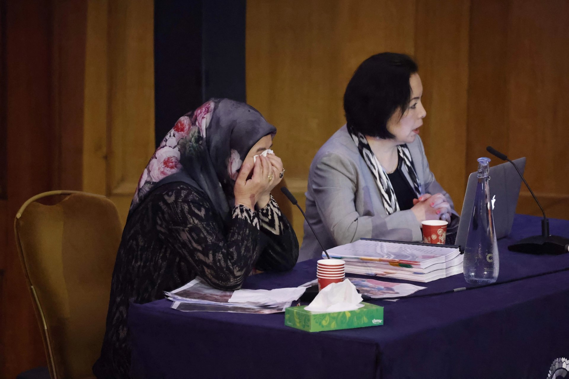 Witness Patigul Talip (left) breaks down as she speaks through an interpreter (right) on the first day of hearings at the Uyghur Tribunal Photo: Tolga Akmen / AFP via Getty Images