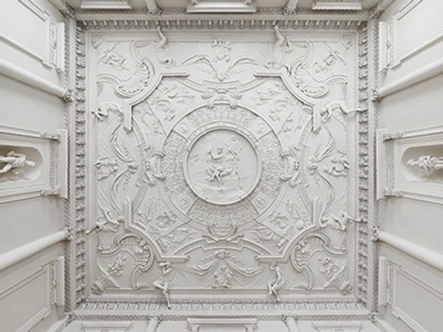 Drawing on Ovid’s mythologies, most leading mural artists turned “patrons into gods, the actual walls of their houses into imaginary landscapes and their ceilings into heavenly vaults”. In the Heaven Room at Burghley, Verrio’s 1690s interior triumphantly creates an architectural illusion filled with heavenly bodies that overwhelm the viewer like few other British interiors.