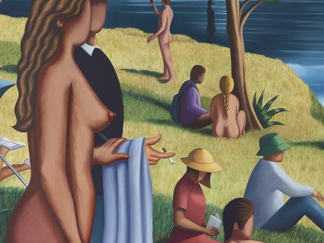 Julie Curtiss's star has risen fast over the past two years. Following a spate of astounding auction results that transformed her from emerging artist to market darling at breakneck speed, she signed to White Cube in February 2020. Unsurprisingly, her highly anticipated first UK solo show doesn't veer far from the style that has brought her mega success. Bringing together a group of new oil paintings, monochrome gouaches and small sculptures, it delivers an uneasy balance of the grotesque, absurd and captivating. Le Futur (2021), painted on a circular canvas, is Curtiss's Surrealist take on Seurat's masterpiece A Sunday Afternoon on the Island of La Grande Jatte (1886), in which flesh is disquietingly painted to resemble the texture of sleek fur. In Coldroom 1 and 2 (2020), the bloody carcasses of cows are too replaced with flowing, shiny waves resembling chestnut locks. The resultant tone is both sterile and obscene, repulsive yet transfixing.