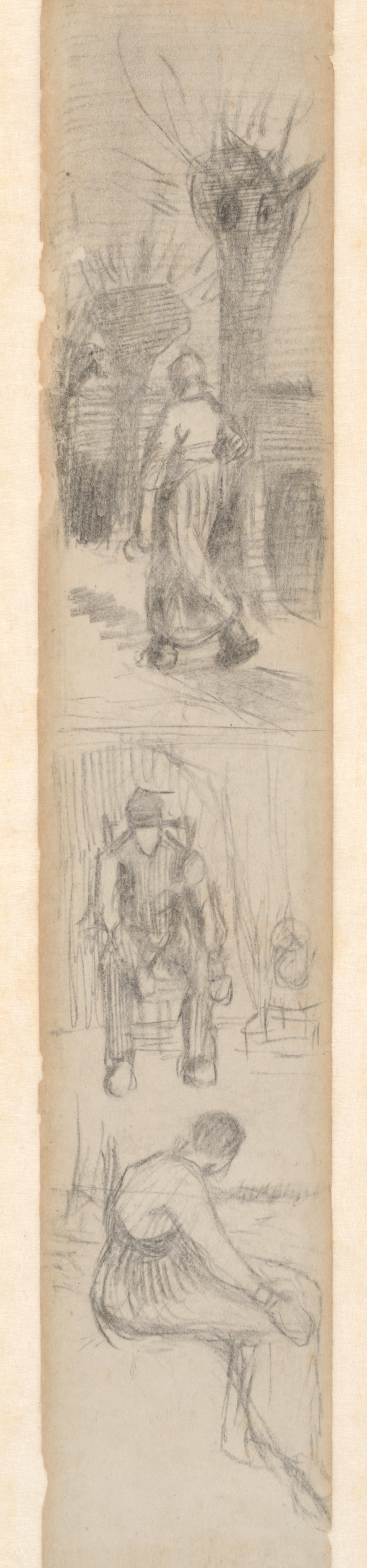 The pencil drawings are crude, since they were done soon after Vincent set out to become an artist, but they are important since so few of his early informal sketches survive. Stylistically, they can be dated to autumn 1881, when he was living in his parent’s village of Etten and was deeply interested in capturing figures of the local peasants at work.