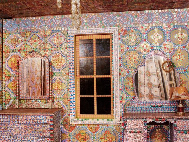 However, sometimes vulnerable objects are transferred to the museum for safekeeping, and imperilled sites enter the collection in their entirety, as in the case of Loy Bowlin’s Beautiful Holy Jewel Home. Bowlin, a self-described “original rhinestone cowboy”, covered the interior and part of the exterior of his house in McComb, Mississippi with bright paint, construction paper, glitter and rhinestones. In 1998, the Kohler Arts Center acquired four original walls and a portion of the exterior.