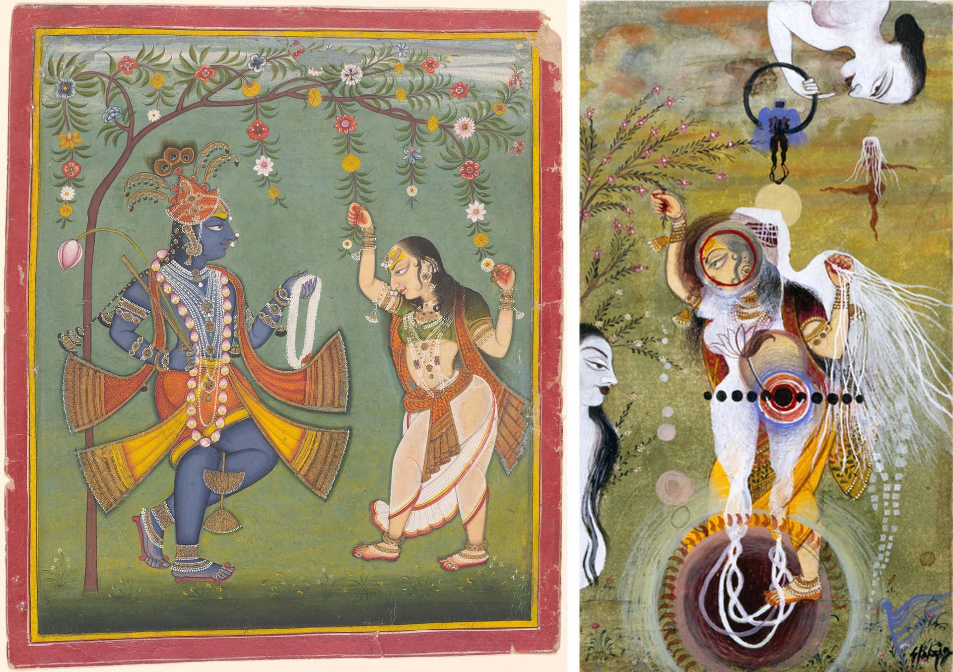 Left: the manuscript miniature Kṛṣṇa and Rādhā beneath a flowering tree. Right: Shahzia Sikander's Uprooted Order, Series 3, No. 1 (1997) Courtesy of the artist and the Morgan Library and Museum, New York