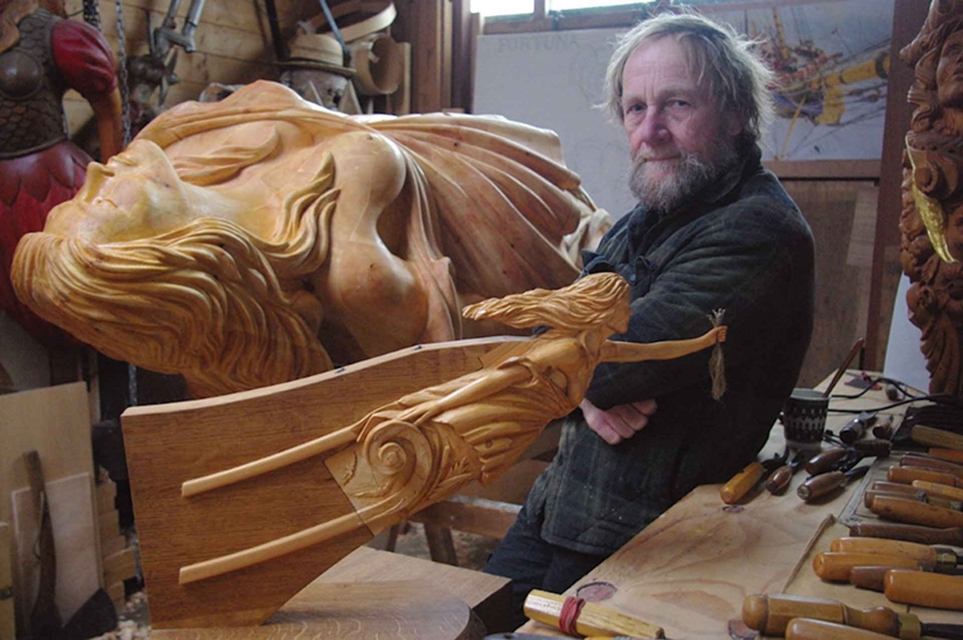 He has researched extensively and written on the history of ship-carving and reveres the work of Frederick Hellyer, who came from a famous family of carvers and made the Cutty Sark’s original figurehead, which was decapitated in a storm in the 1870s. The present version was carved by Arthur Levison, who did his best. “He was working at a time when money was tight and resources were limited,” Peters says, adding, “His father was a very good carver.”