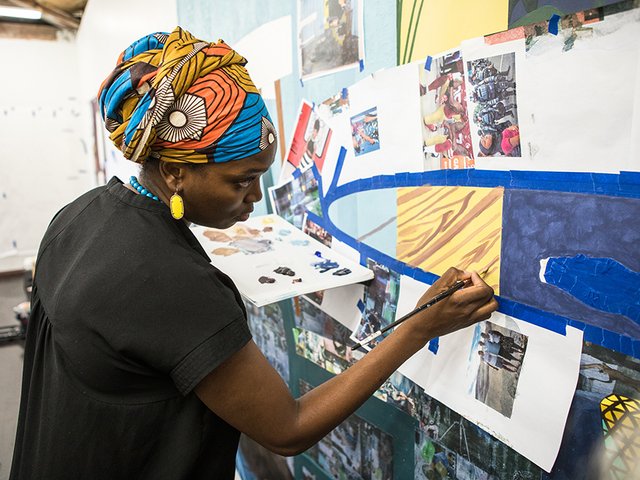 Njideka Akunyili Crosby has collaborated with the Chicago Housing Authority and the Smart’s programme for teenagers to transform her paintings into four mural-like banners displayed on building exteriors—two at the National Public Housing Museum and two at the Minnie Riperton Apartments in Fuller Park, on the South Side. At the Riperton Apartments, residents were asked to vote for their favourites among Crosby’s images evoking family life and domestic love, which were then sized to the buildings in banners some 40ft high, one of which is visible on the major thoroughfare.