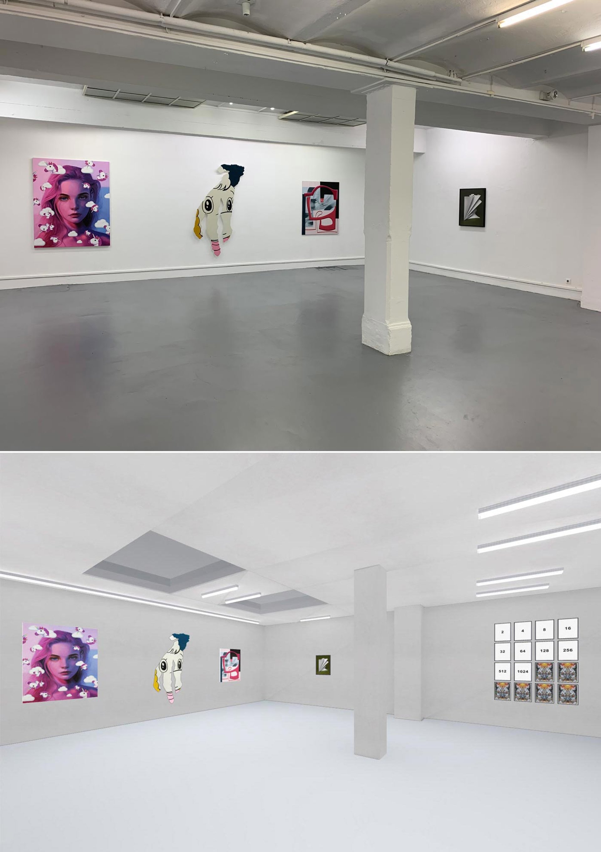 The same area of the exhibition In Real Life (top) and as a virtual space Installation photograph: Jürgen Dehm
