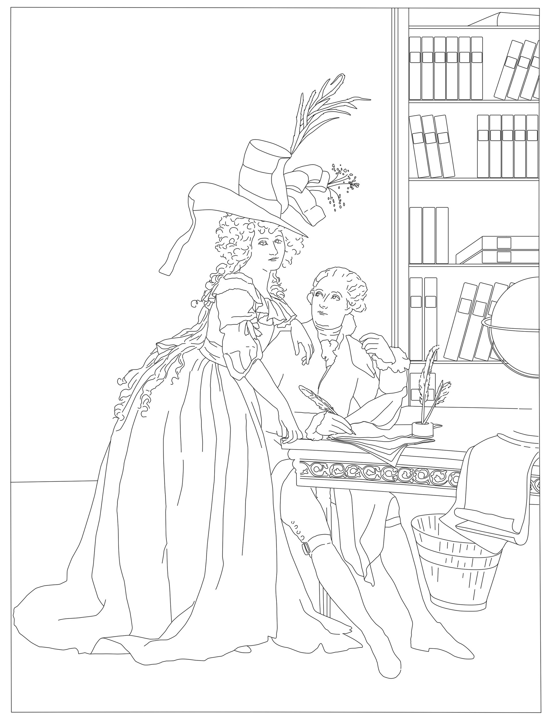 A drawing produced with tracing information obtained through infrared reflectography and macro X-ray fluorescence. It reflects Jacques-Louis David's original rendering of Antoine Laurent and Marie-Anne Lavoisier in a 1788 portrait. Department of Paintings Conservation, Metropolitan Museum of Art, New York. Originally published by The Burlington Magazine