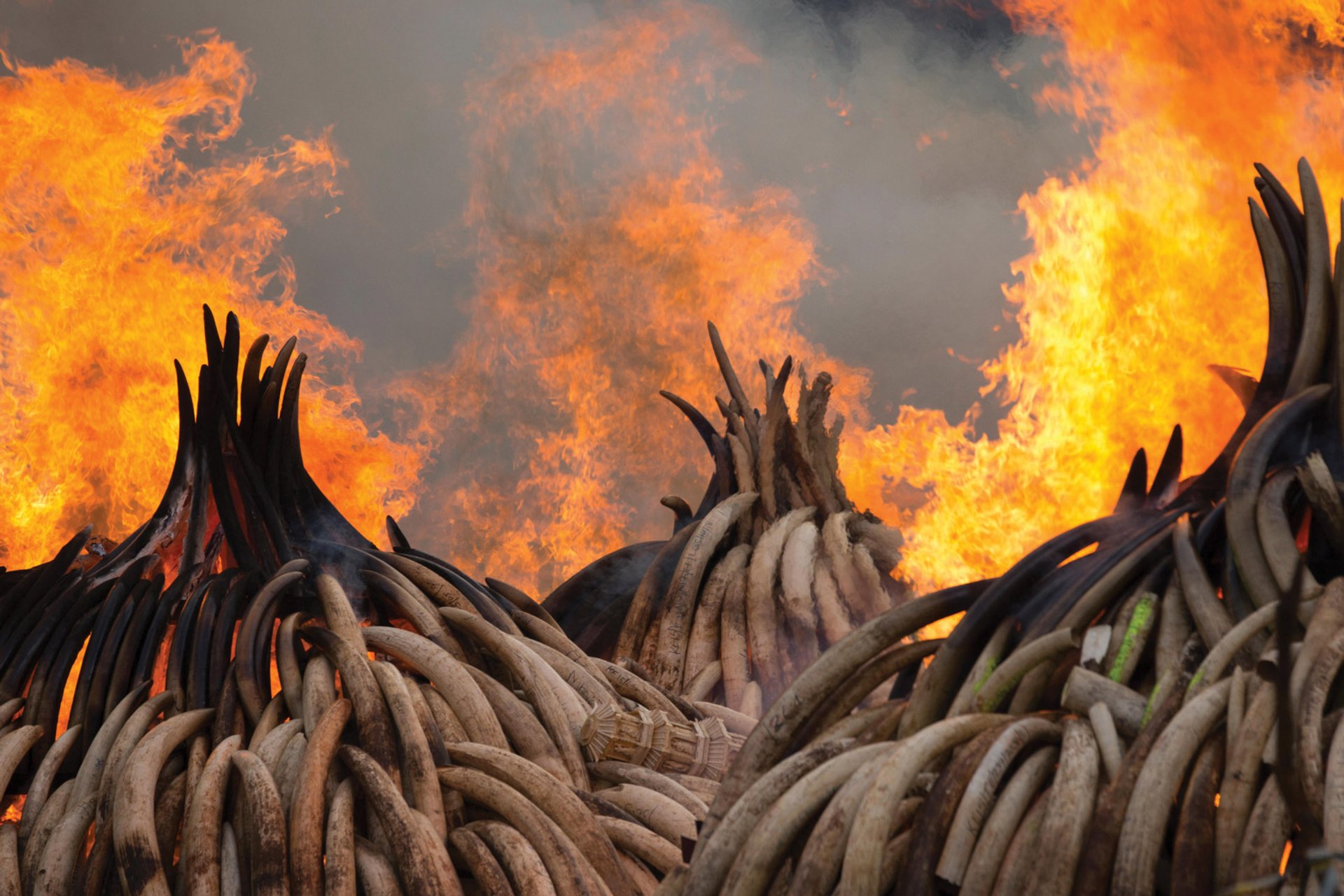 A pile of confiscated tusks in Kenya being burnt to prevent it re-entering circulation © Nature Picture Library/Alamy Stock Photo