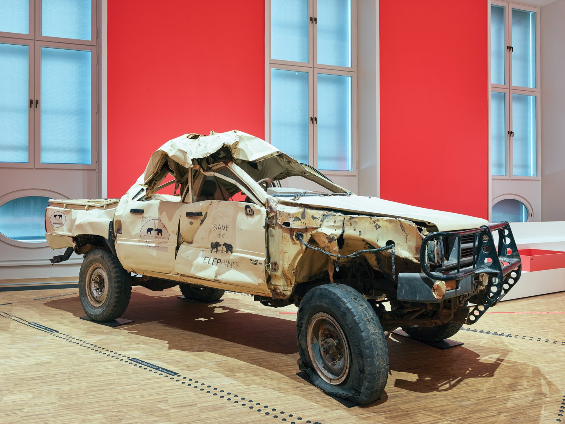 The exhibition has on display the remains of an off-road vehicle following an encounter with an aggressive elephant © 2020 by Alexander Schippel