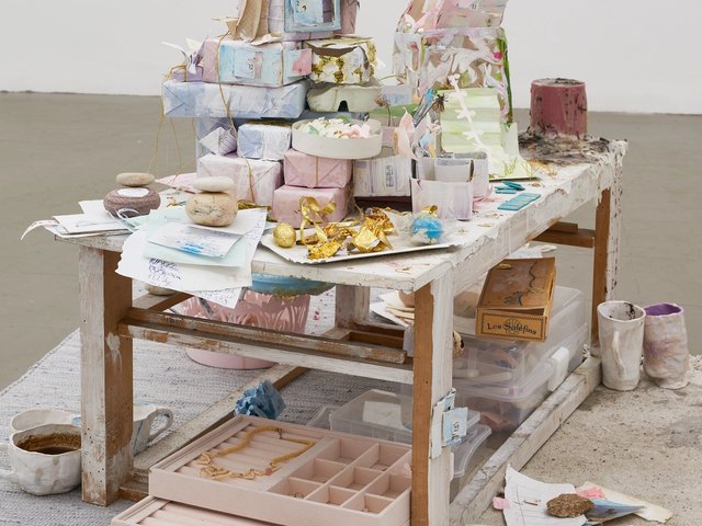Attempting to answer this question are nine sculptures that occupy the gallery’s lower two floors, in which Nestler stitches together markers of modern womanhood into surreal, composite pieces. These take on forms as varied as a horse's head with a silver braided wig, or a pink gym bag with a set of splayed legs affixed on top. The works, many of which are made from reupholstered cushions and athleisure apparel, are plush, precisely formed and contain a campness that speaks to the inherent theatricality of performing the rituals of an aspirational, millennial lifestyle. The best are those in the basement which call back to women from ancient mythology, such as Spinner, referencing the Greek tale of Arachne. Her rust-coloured velvet belly and conical breasts are surrounded by 10 appendages splayed on a wall. A faint ticking emanates from a metal timepiece in place of her head, quite possibly her biological clock threatening to run out before she's received a promotion at work.