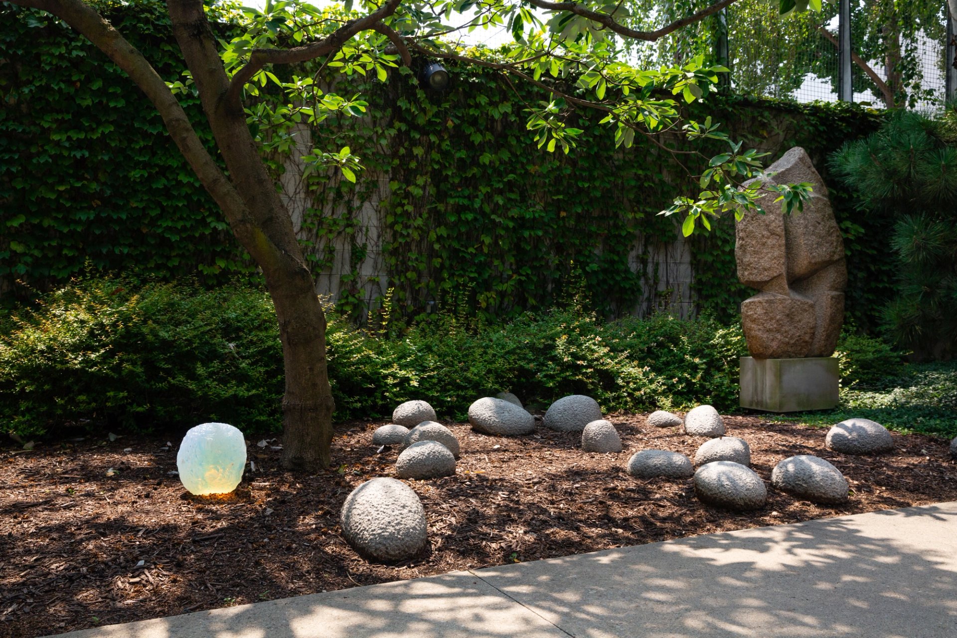 Objects of Common Interest's Offerings–Rock III (2000) next to Isamu Noguchi's Practice Rocks in the museum's sculpture garden Photo: Brian W. Ferry