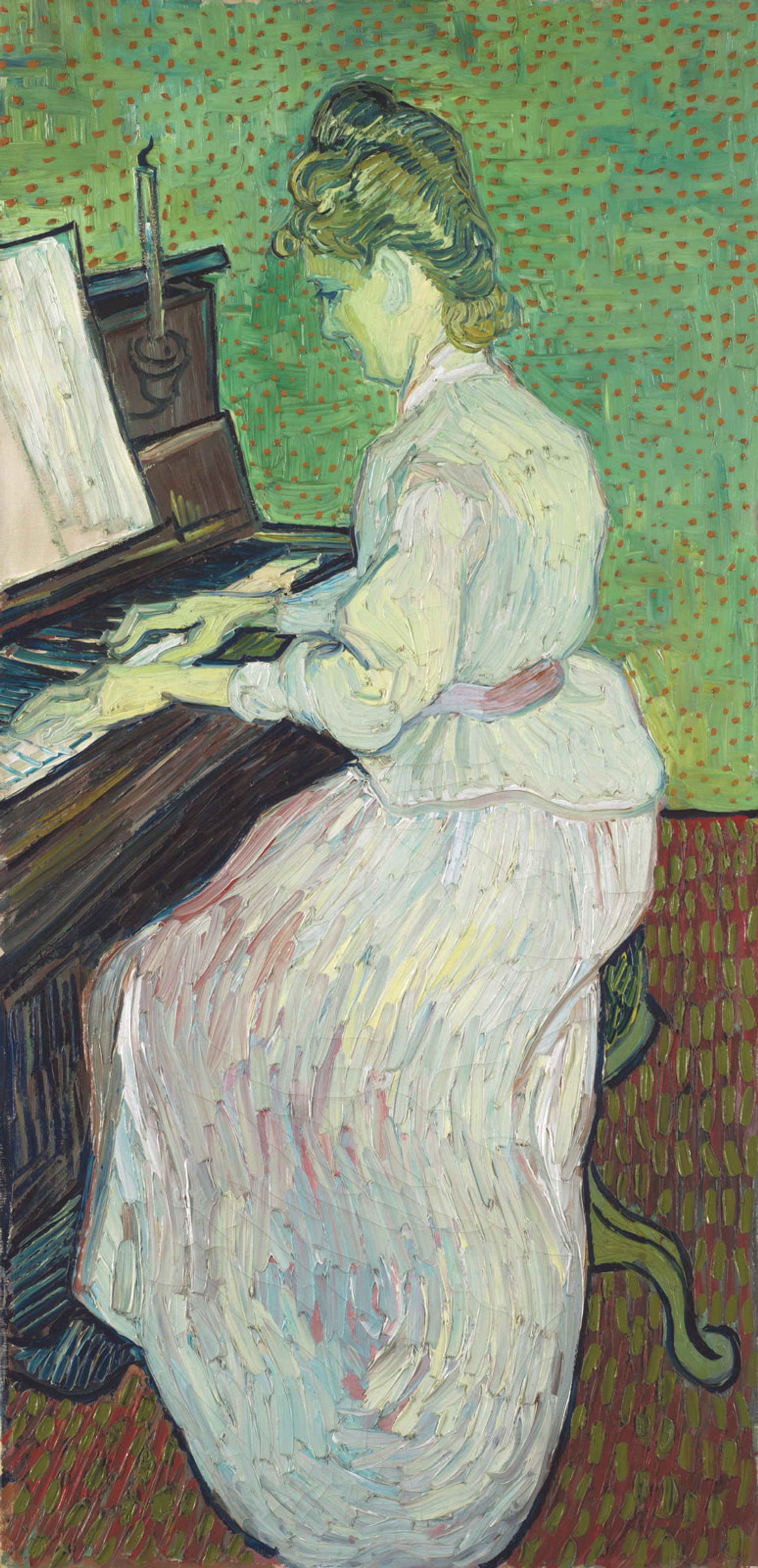 Marguerite’s over-elongated fingers strike the keys as she concentrates on the music (Van Gogh was never very good at painting hands). It is not so much a portrait of her as an individual, more a timeless depiction of a musician engrossed in a melody.