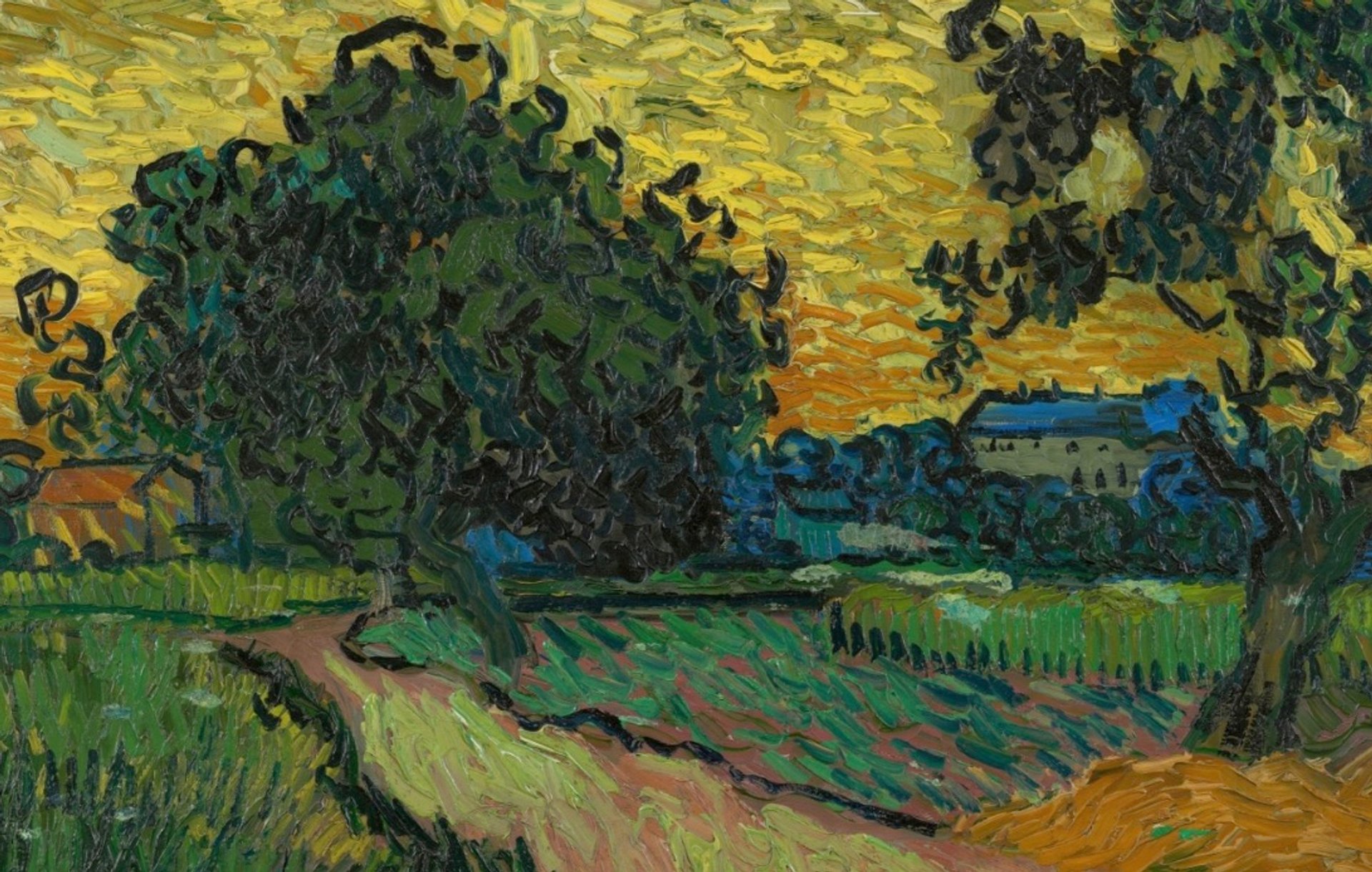 In the painting the path on the left leads the eye towards a solitary farmhouse with a terracotta roof, contrasting with the dark green mass of a large tree. But what gives the picture its impact is the luminous, golden evening sky. Van Gogh was aiming not for realism, but for dramatic effect.